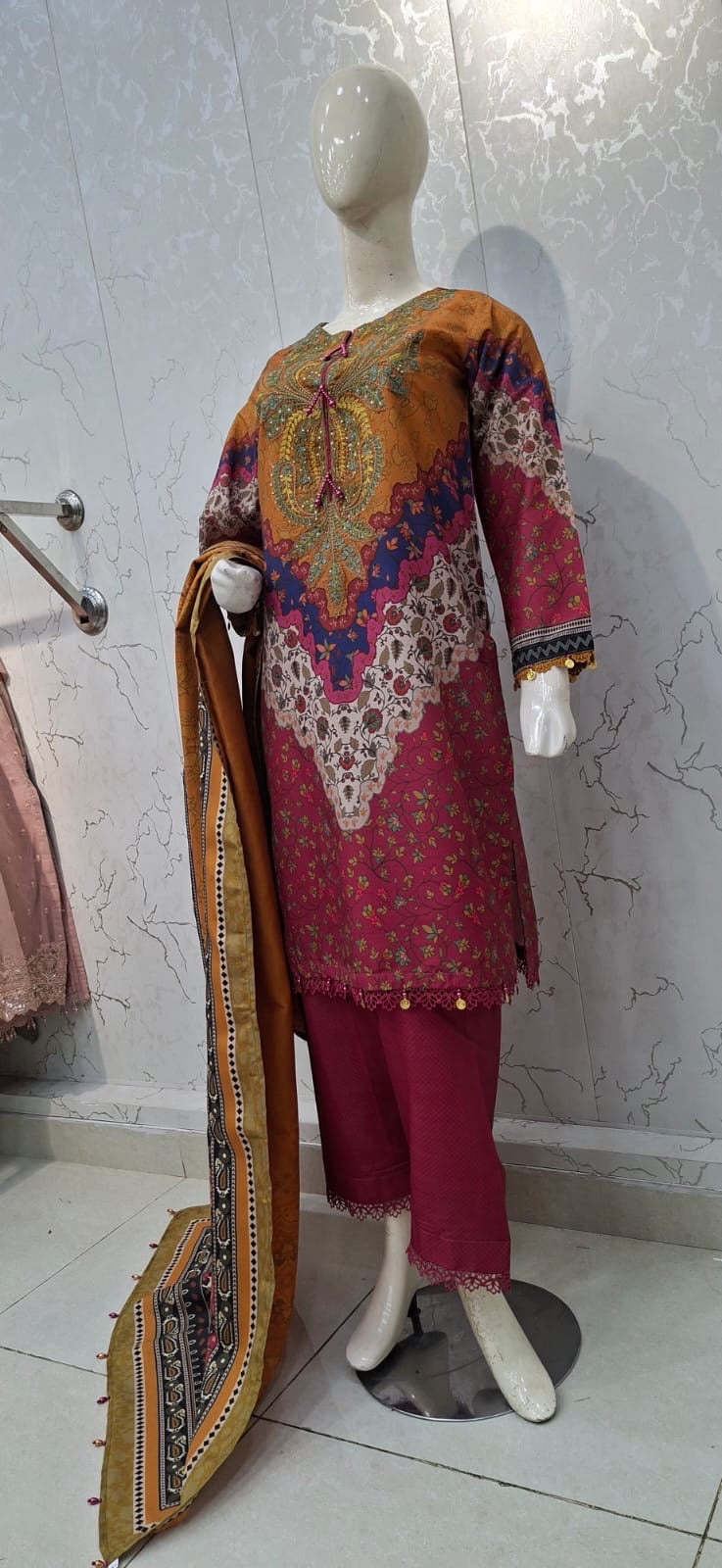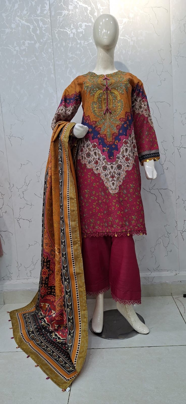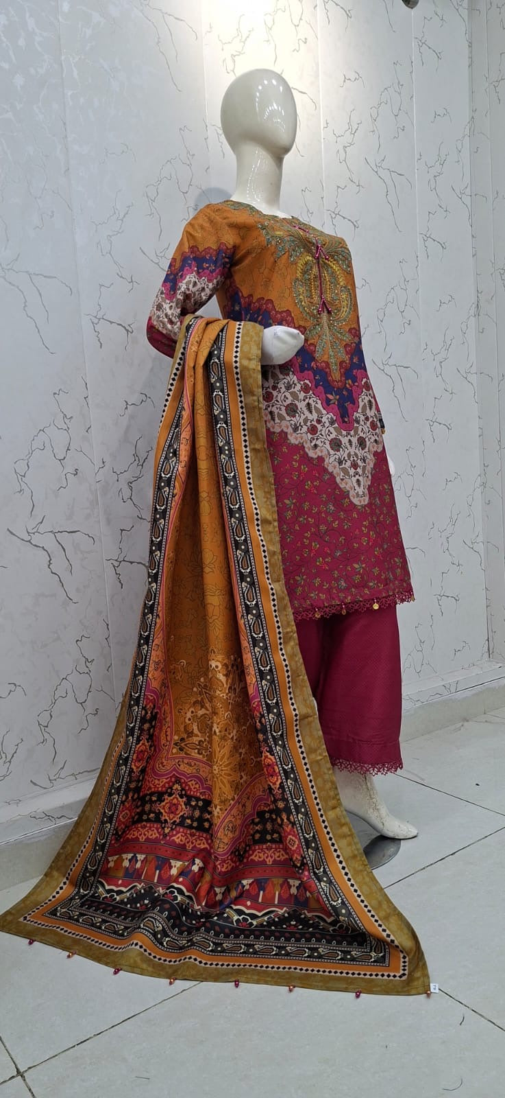Shirt Fabric: Printed Coarse Khaddar Shirt with necklace embroidery and embellishments with lace finishing