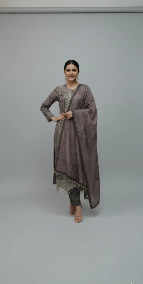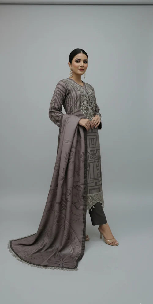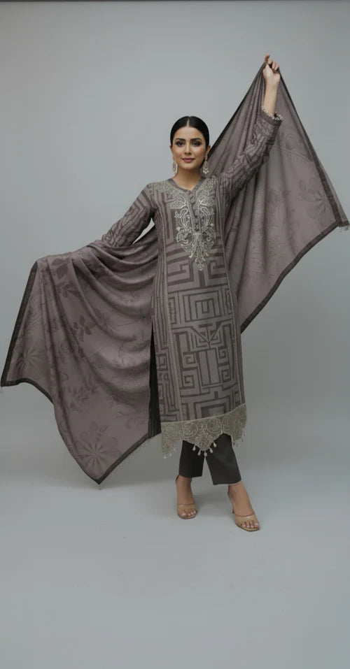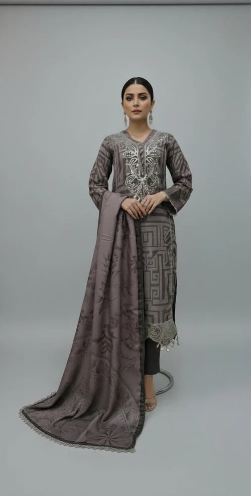 This suit is Printed Coarse Khaddar Fabric primarily in a rich, giving it an elegant and sophisticated look with embroidery Velvet patch neckline with shine sequins and Ghera embroidery Velvet patch and chak Velvet patch detailing with sequins and beads