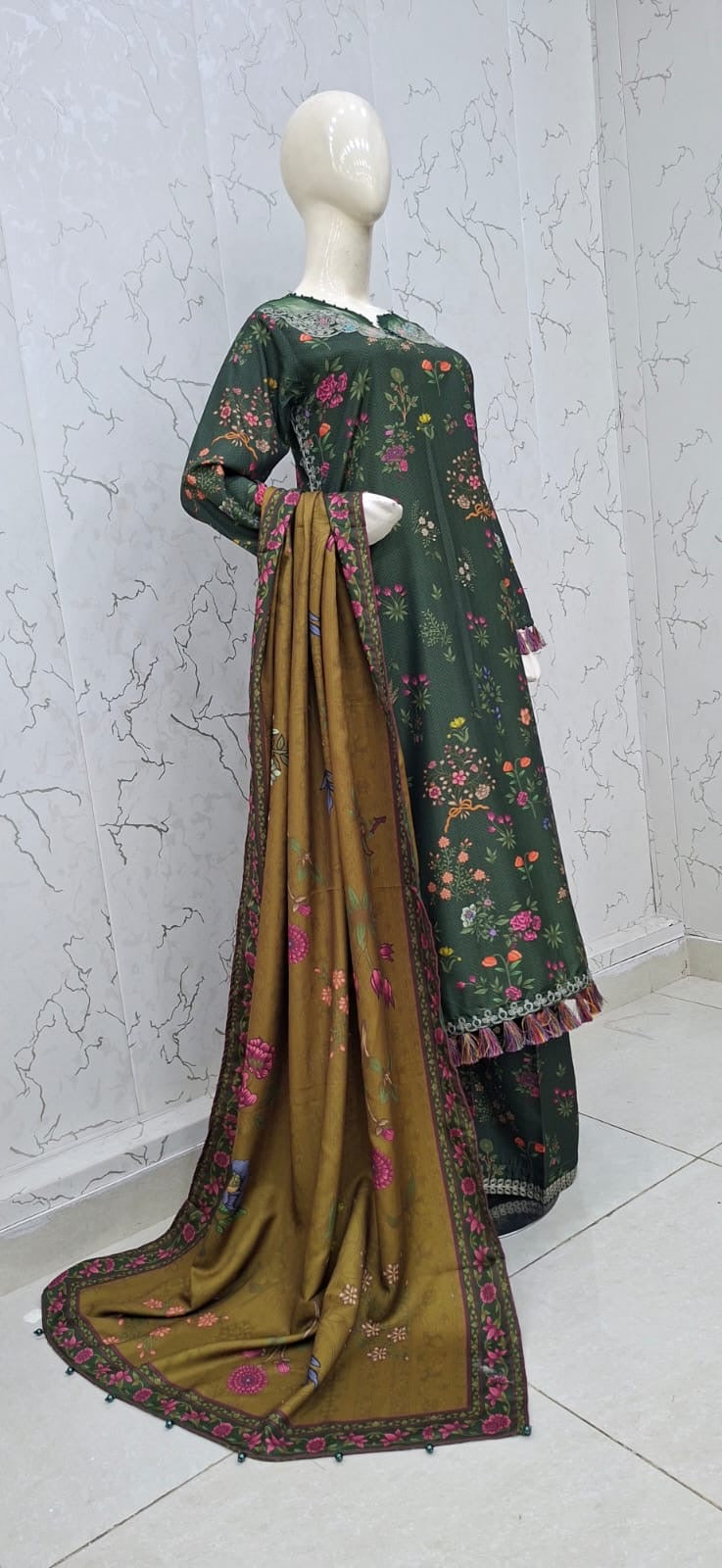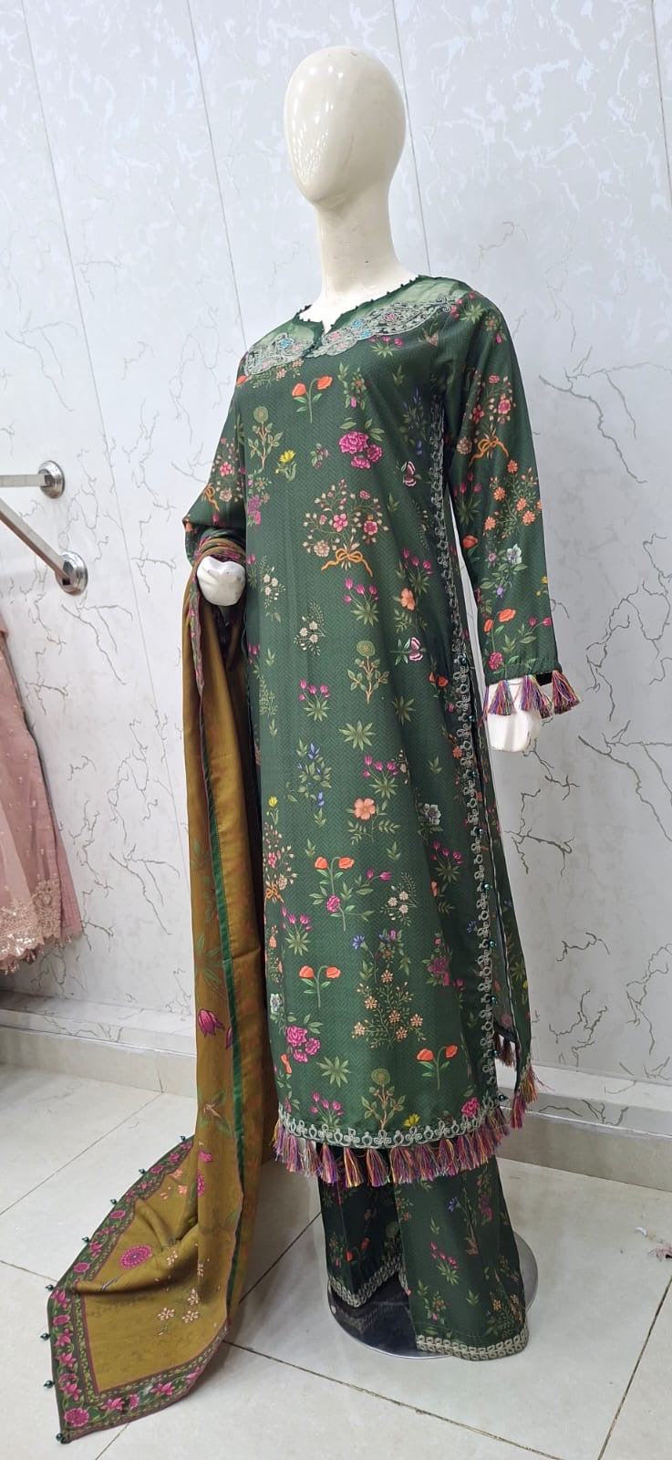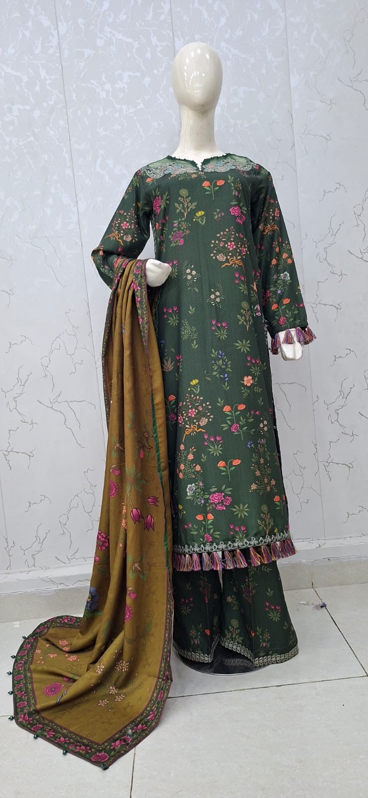 Additionally, the outfit comprises digital printed khadar palazzo pants, which also feature detailed embroidery.