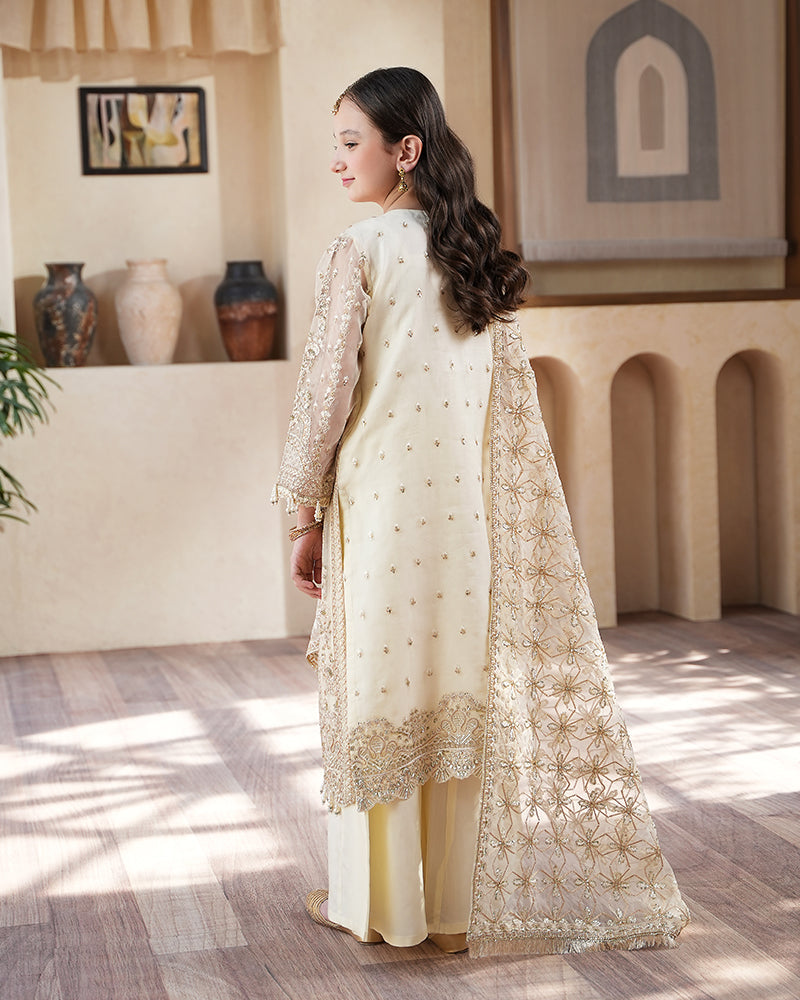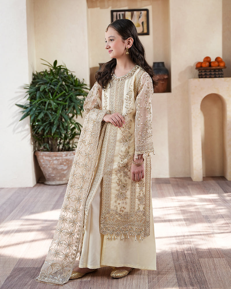 Organza dupatta is elegantly embellished with sequins embroidery, tilla thread, and delicate lace