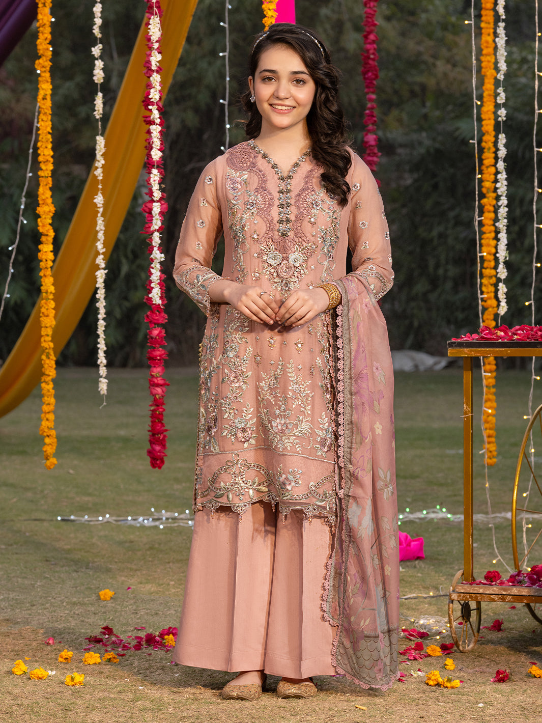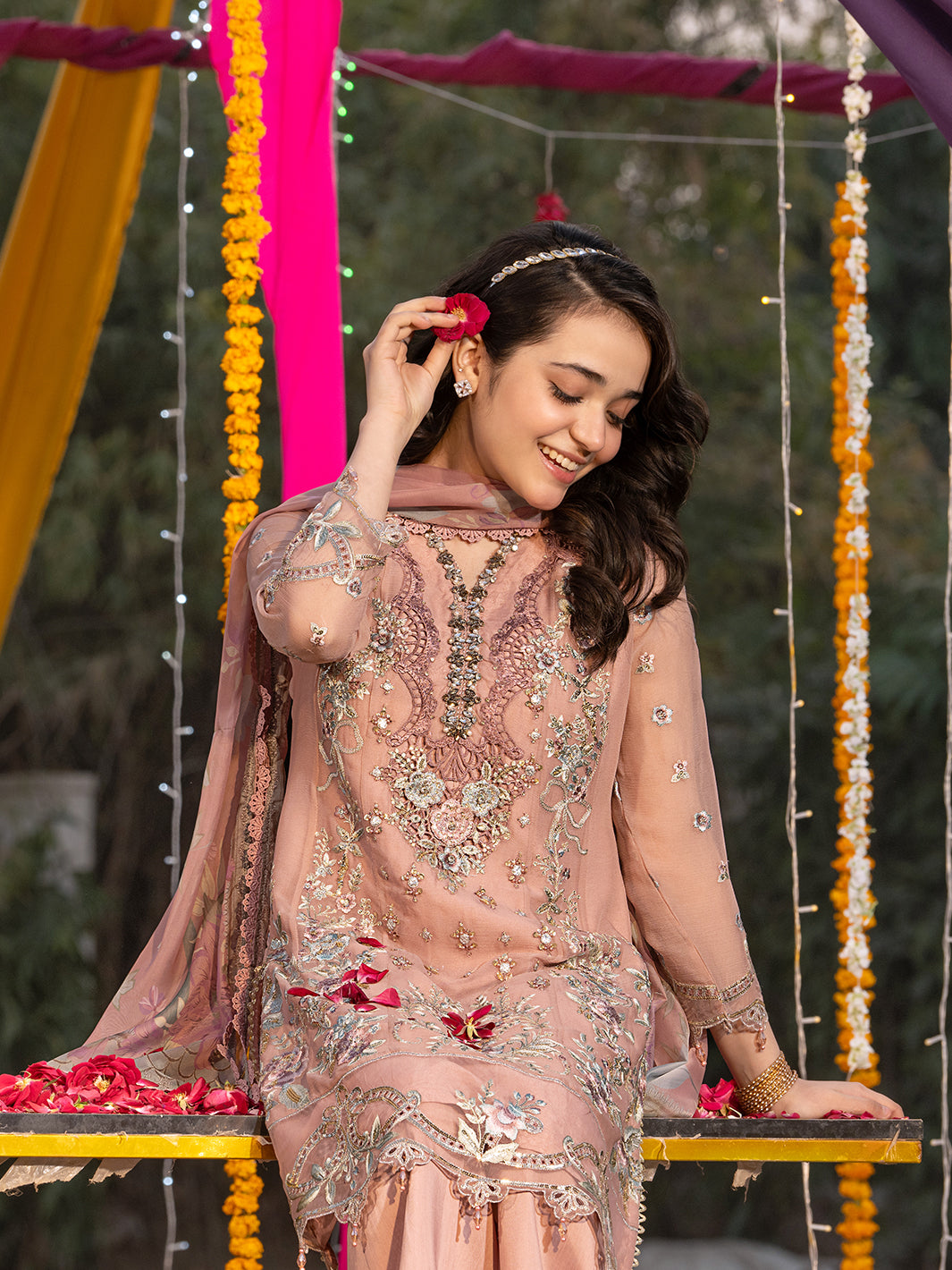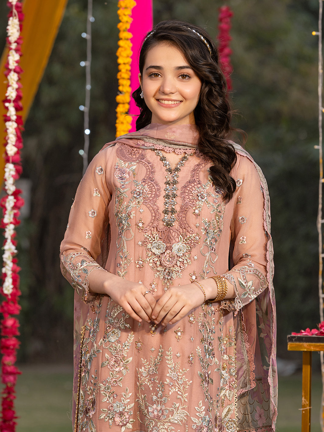 Chiffon shirt featuring sequin embroidery with handcrafted adda work, embellished with crystal stones and 3D floral appliqués, complemented by lace detailing
