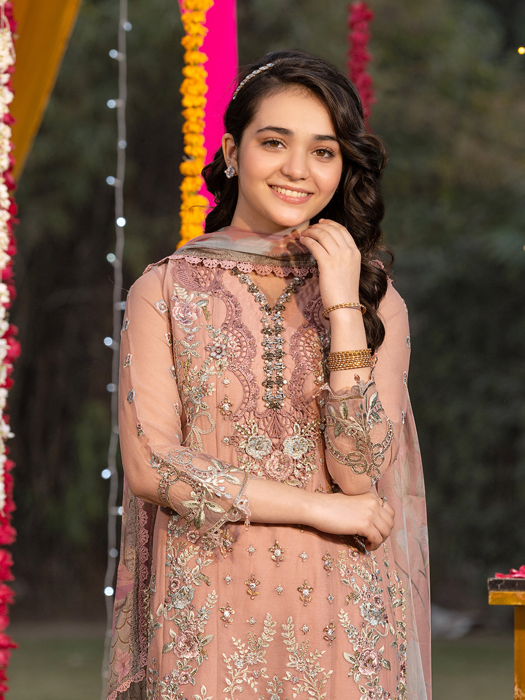 Chiffon printed dupatta adorned with lace accents.