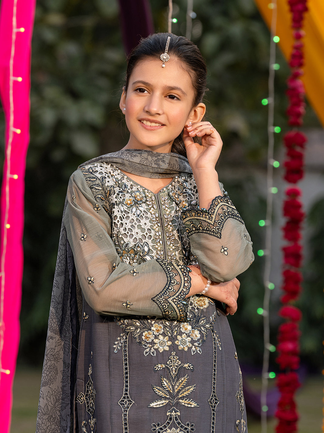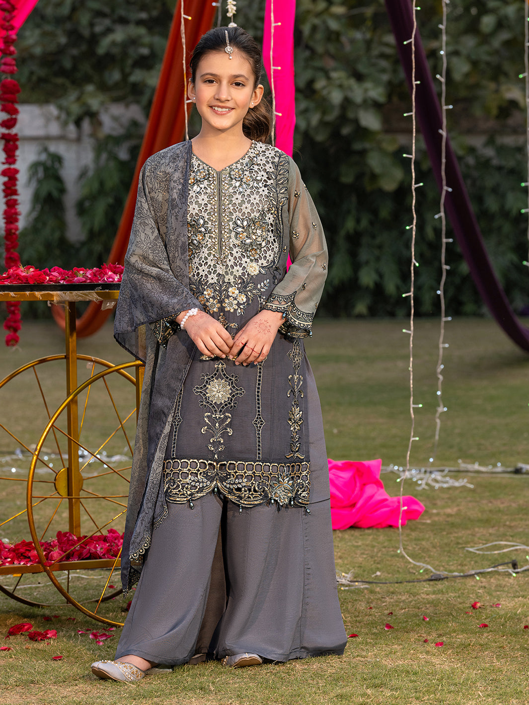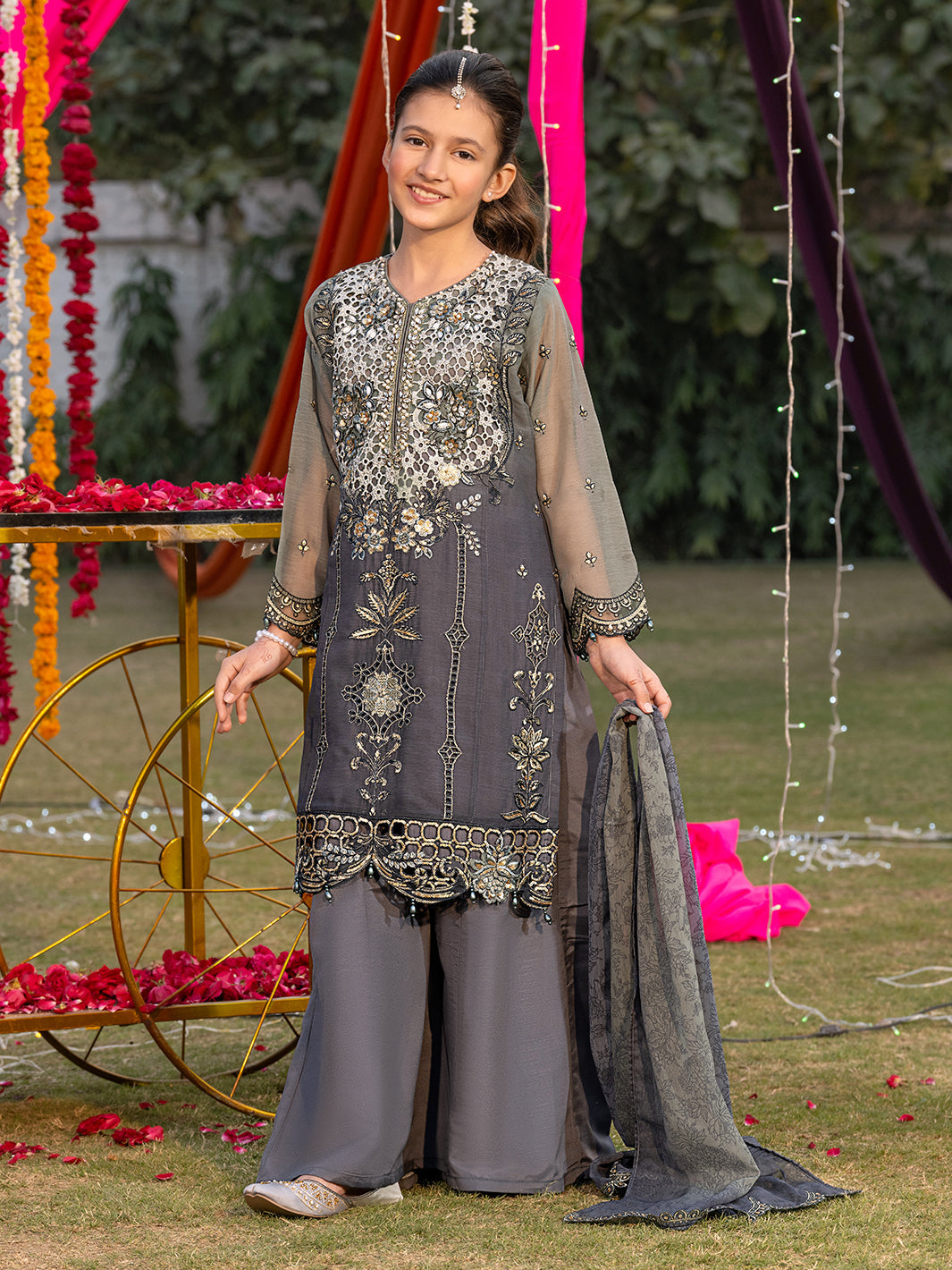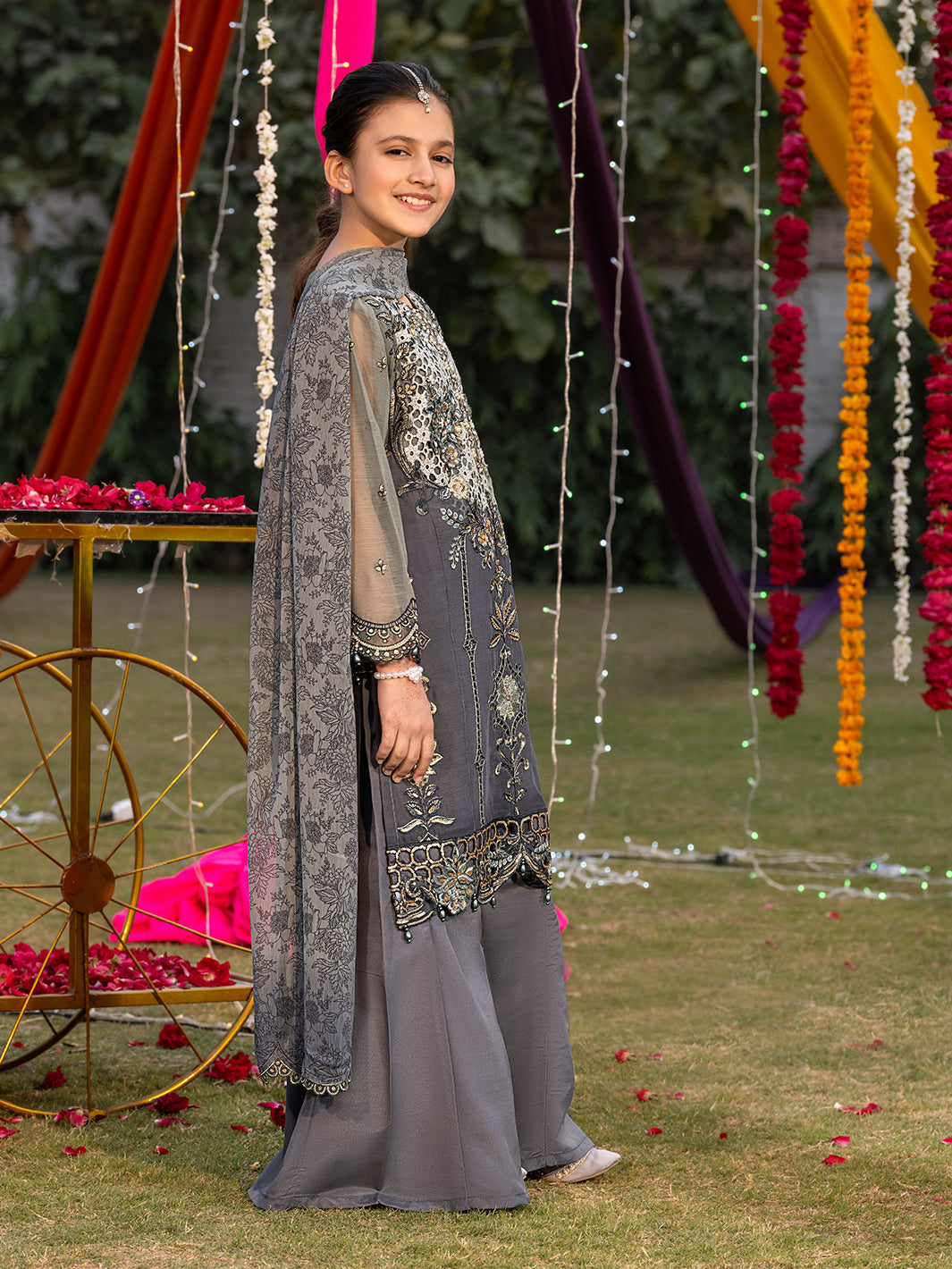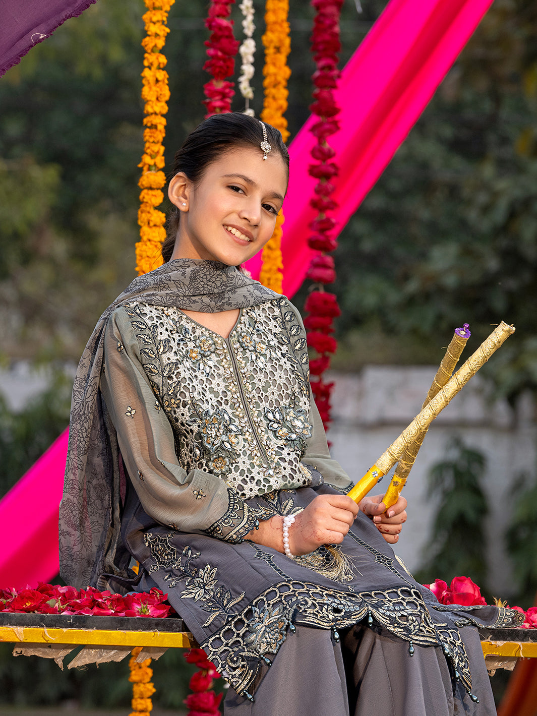 The chiffon printed dupatta is elegantly enhanced with sequin embroidery and scalloped edges
