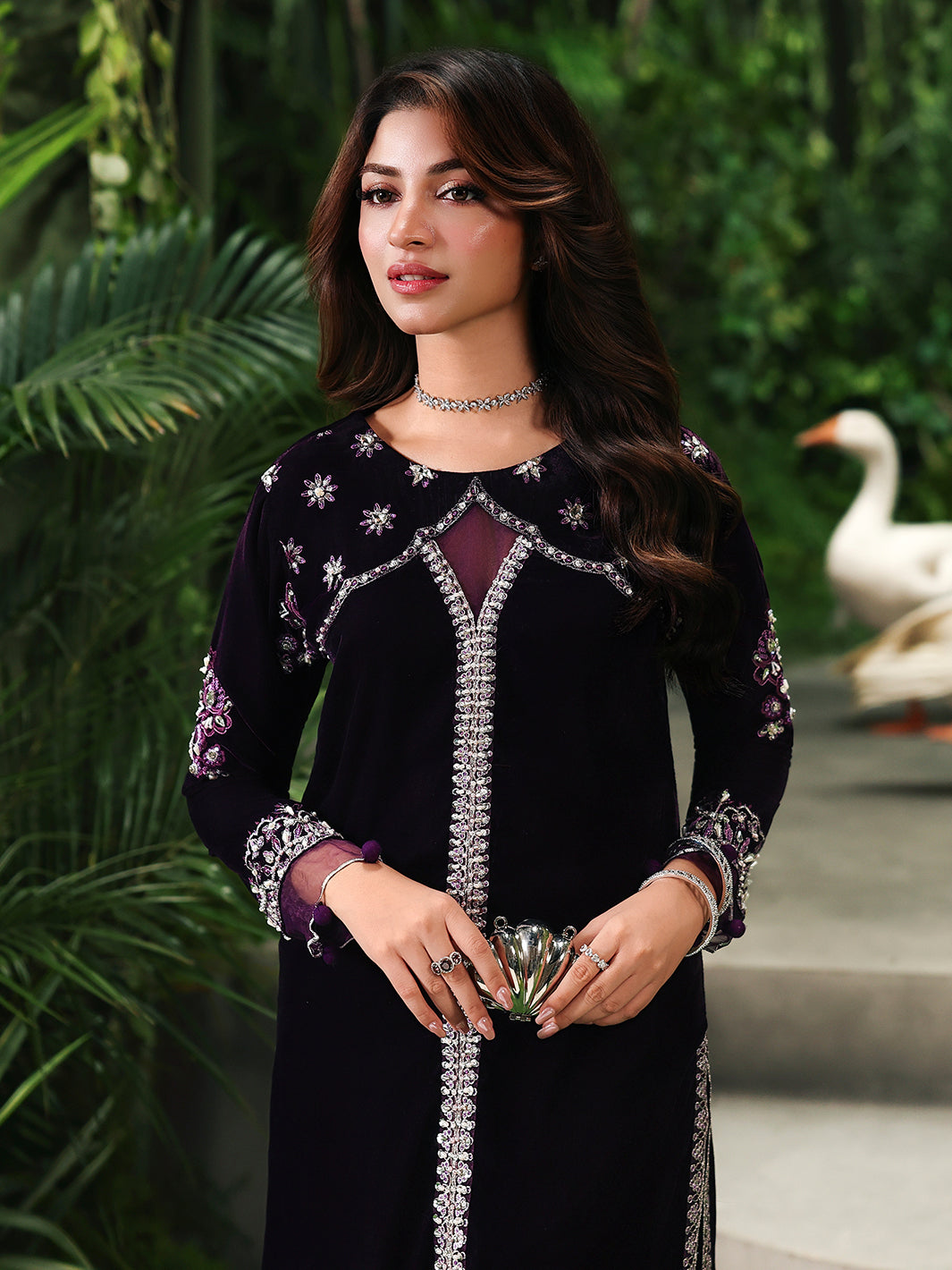 Luxury with our exquisite 9000-micron velvet shirt, adorned with dazzling embroidery, shimmering pearls, sparkling stones, and radiant crystals, all enhanced by intricate cutdana work.