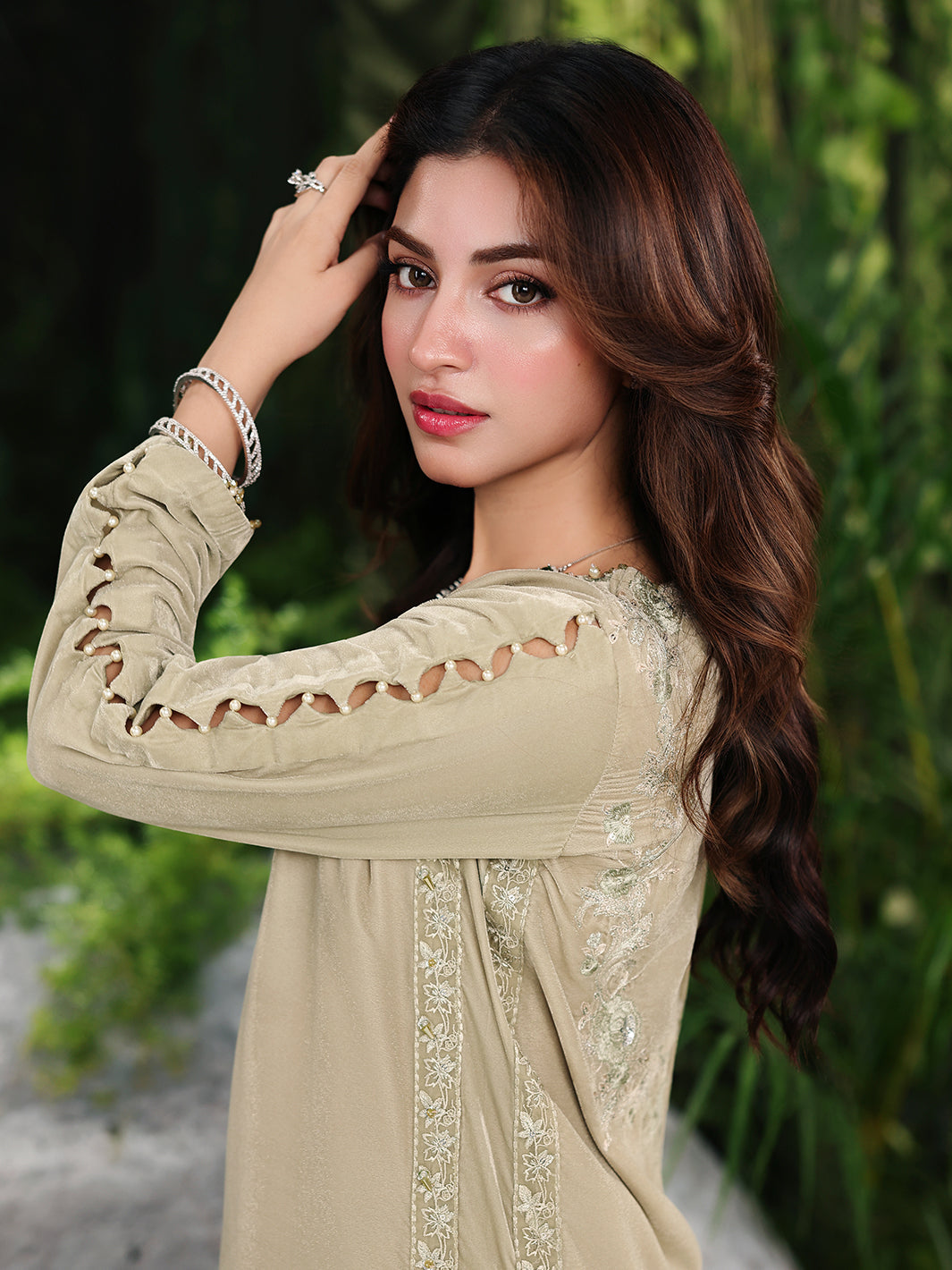 Luxury velvet shirt, made from a sumptuous 9000 micron fabric Adorned with stunning spangle embroidery, shimmering stones, and elegant pearls