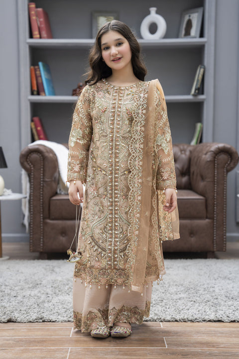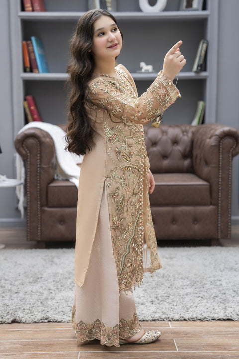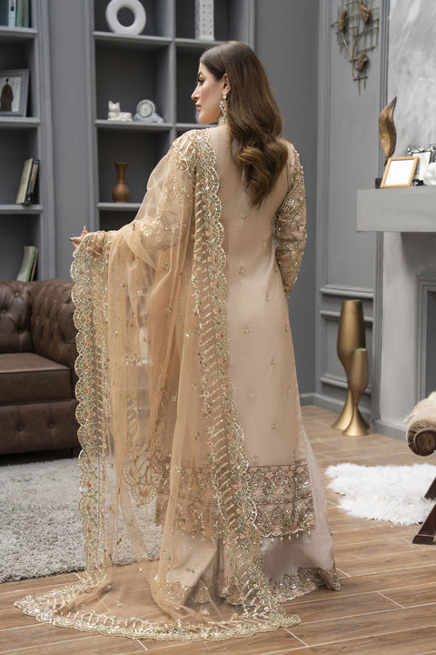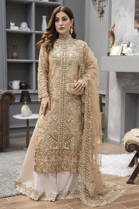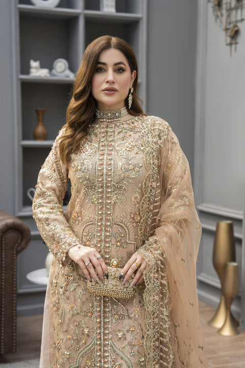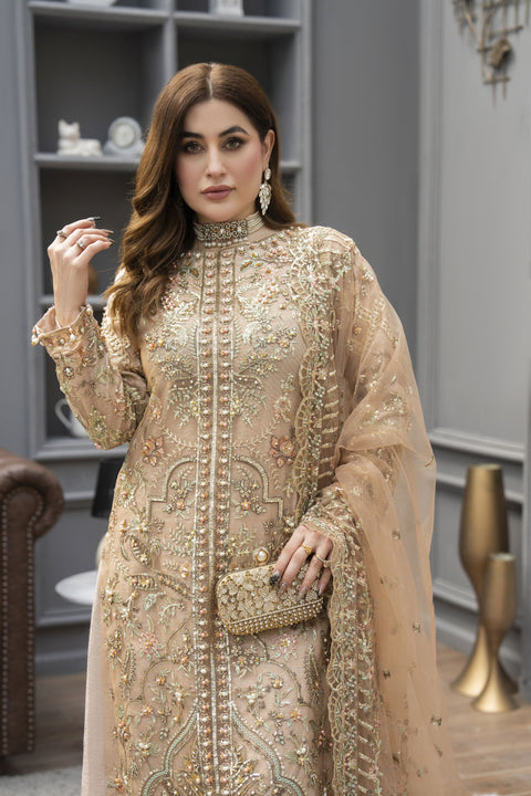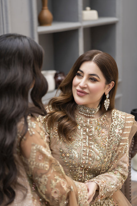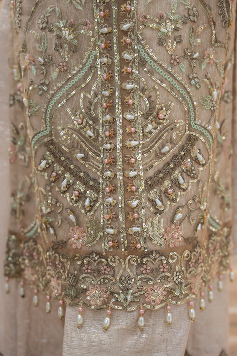 This elegant net sequin-embroidered outfit features handcrafted detailing, pearl embellishments, and a shimmer lining for that perfect glow.