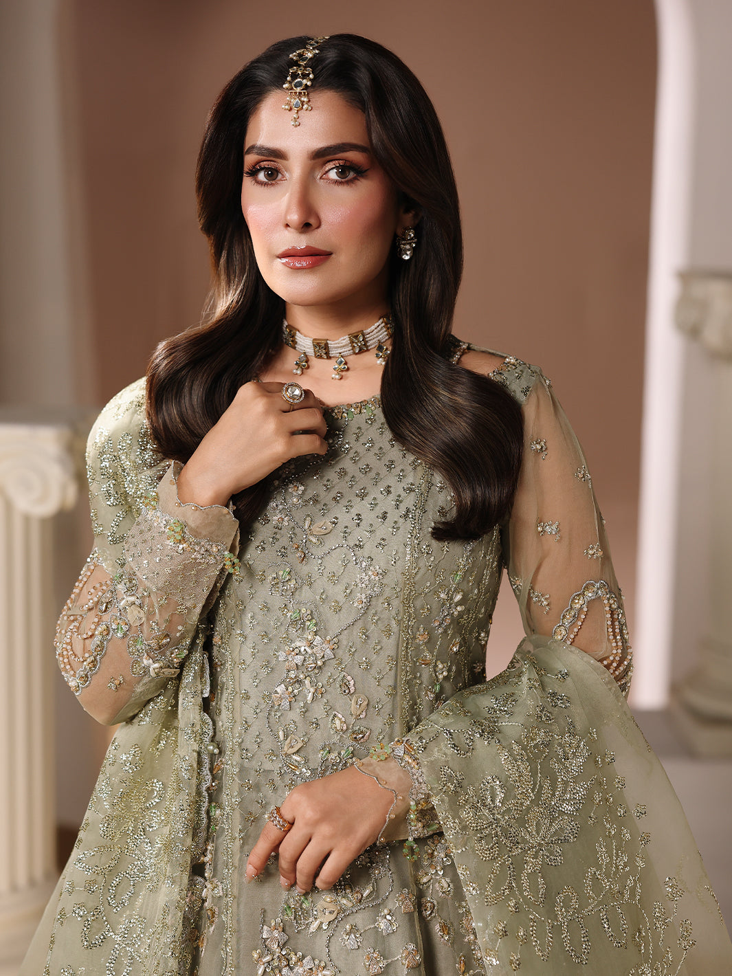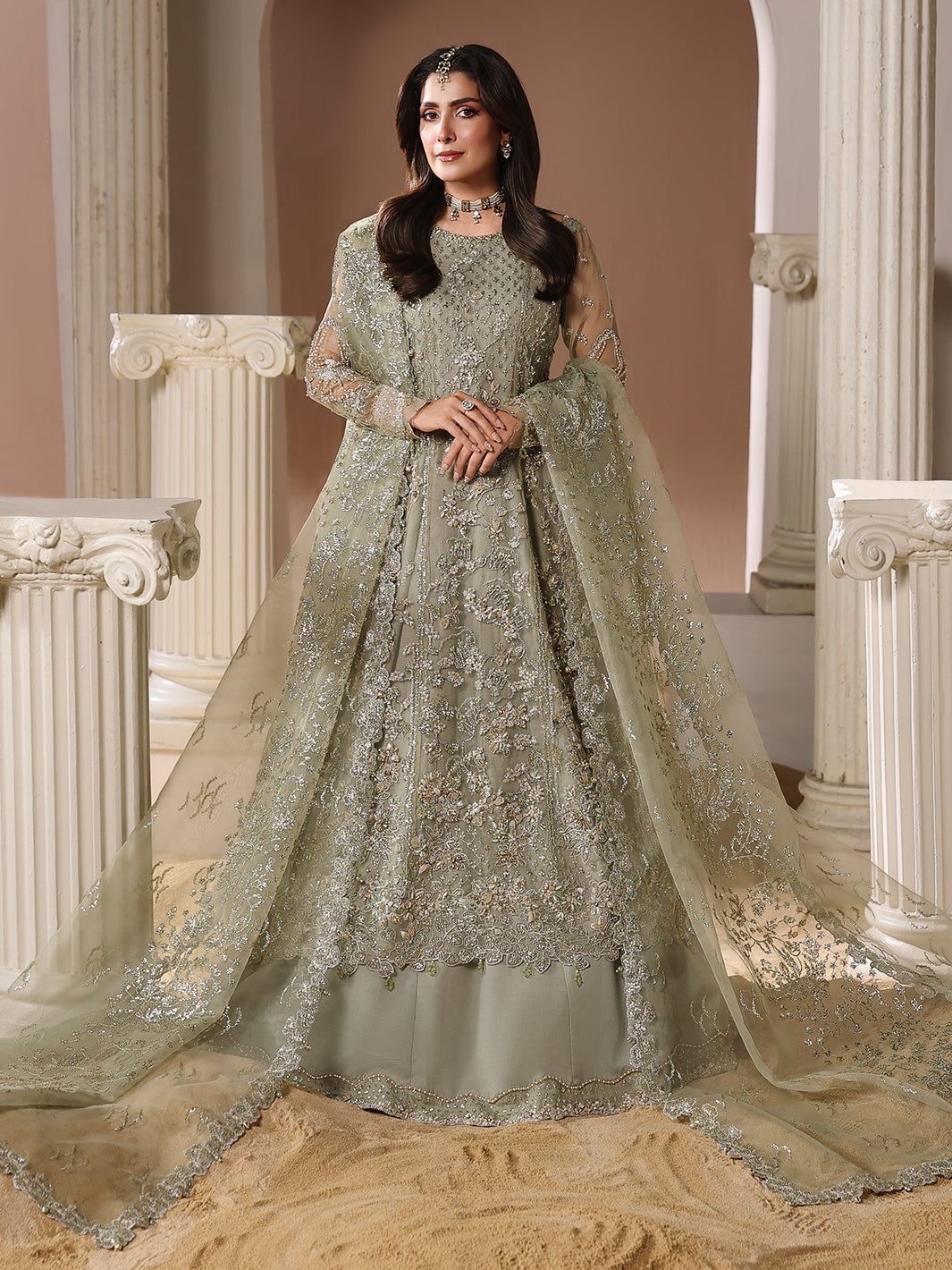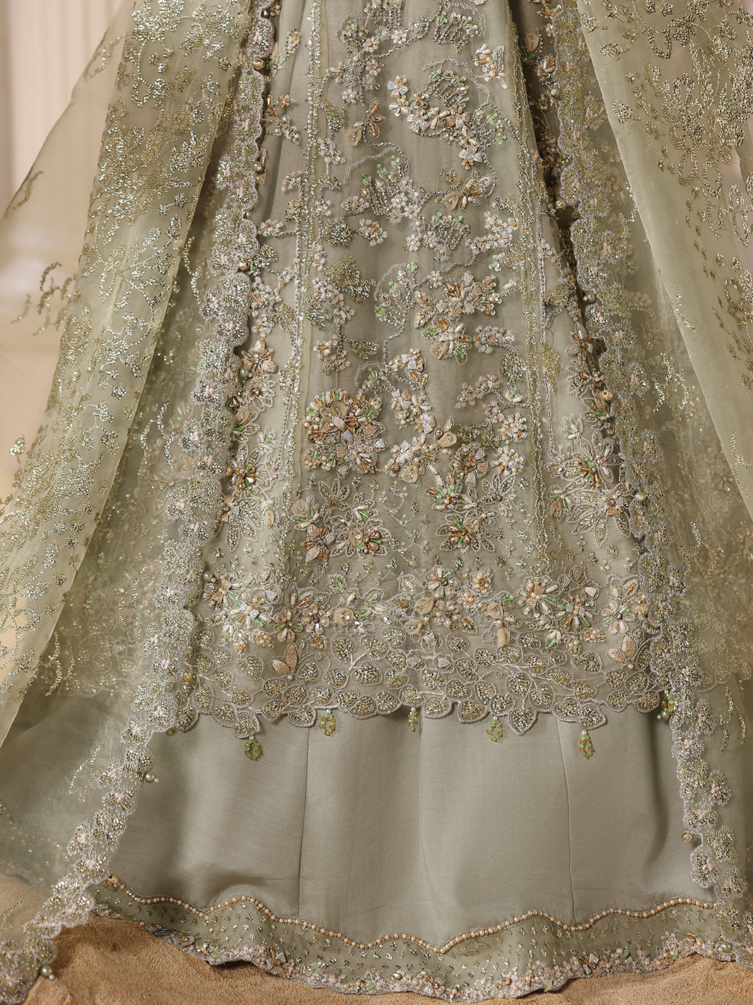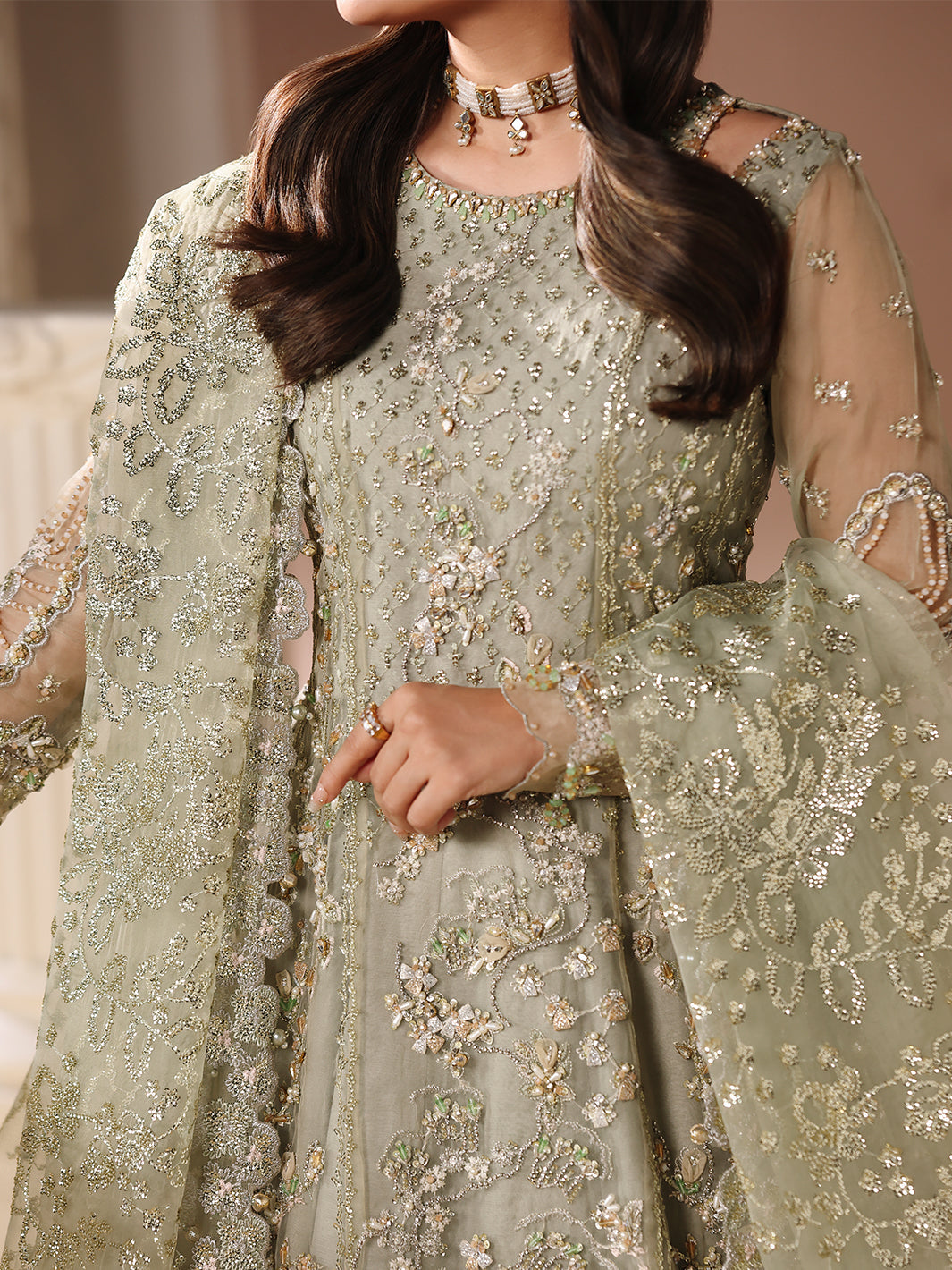 Organza maxi adorned with intricate sequin embroidery, handcrafted adda work, naqshi dabka work, cutdana stones, chainwork, crystals, and 3D floral embellishments.