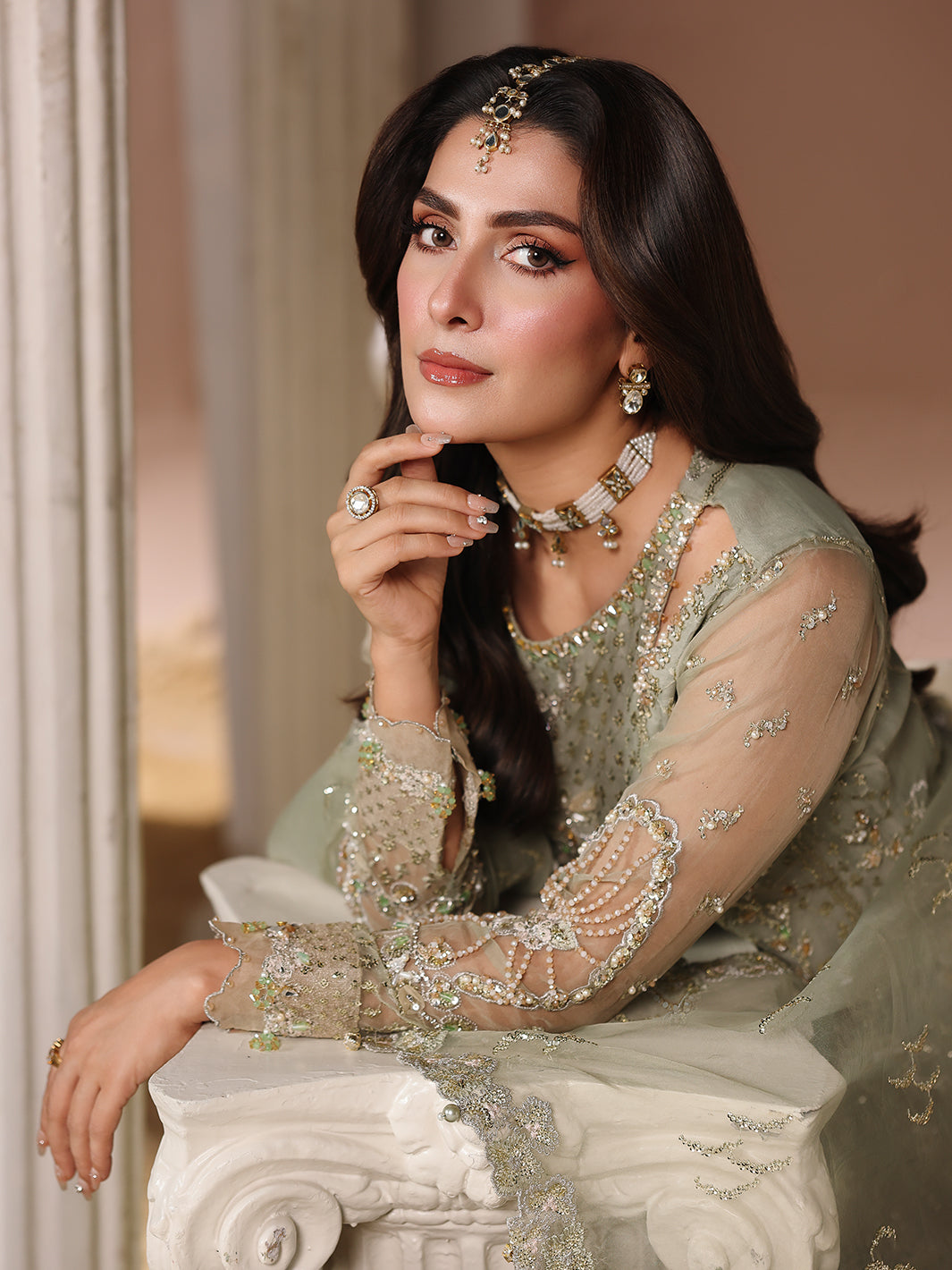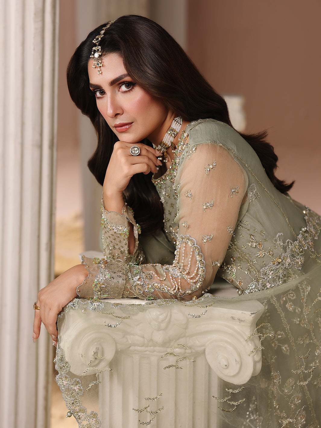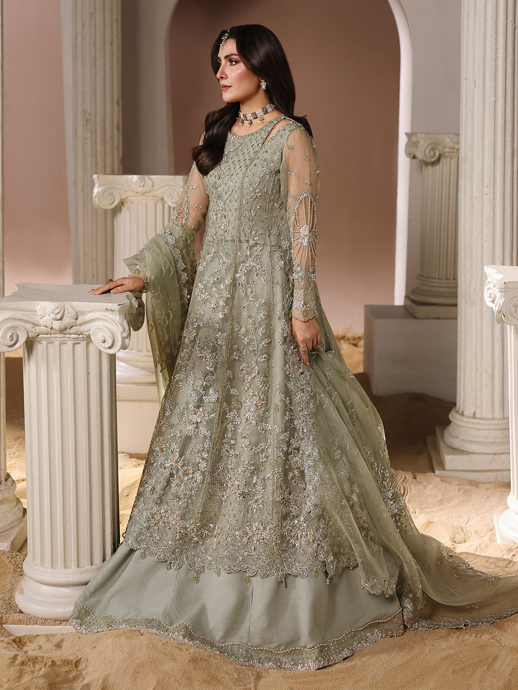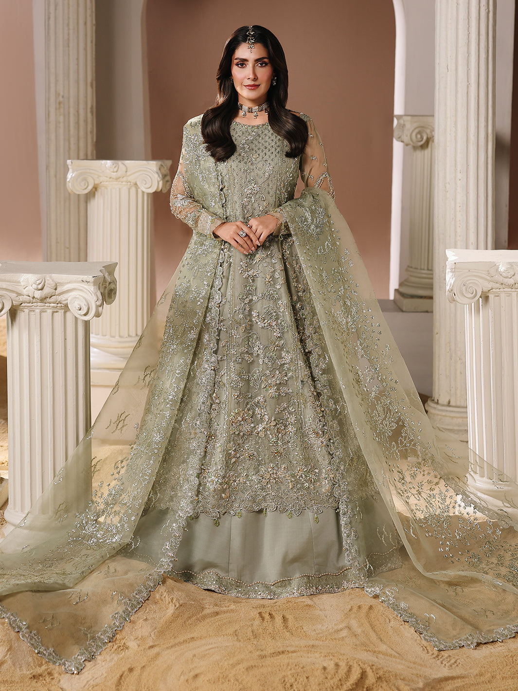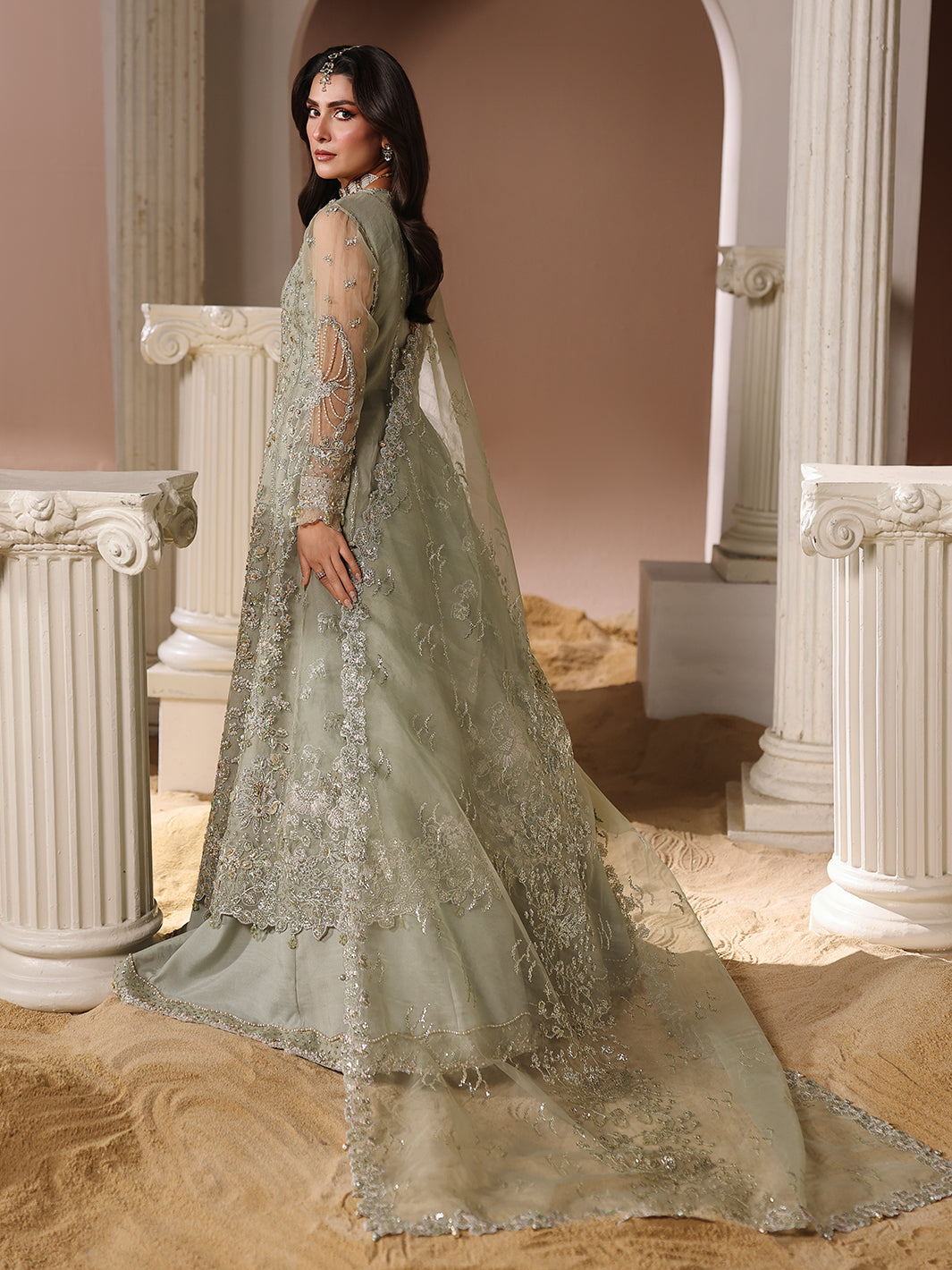 Organza maxi adorned with intricate sequin embroidery, handcrafted adda work, naqshi dabka work, cutdana stones, chainwork, crystals, and 3D floral embellishments.