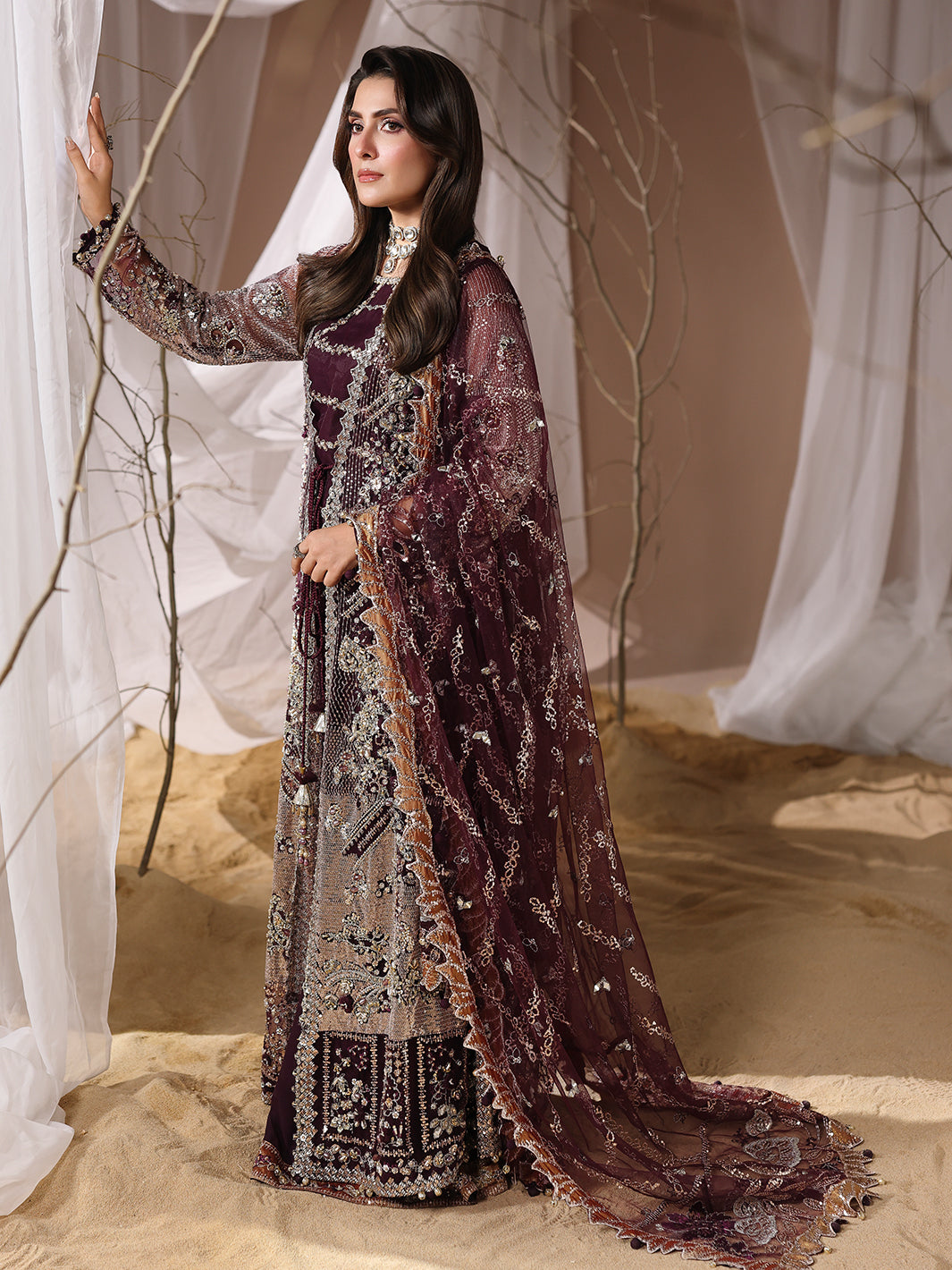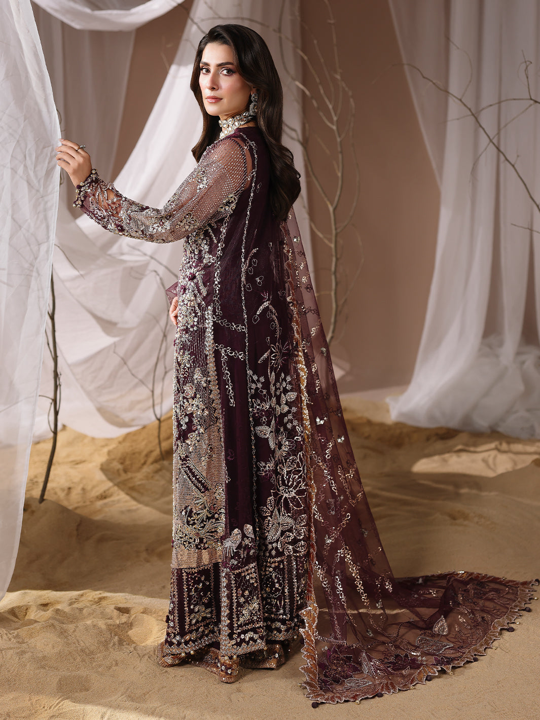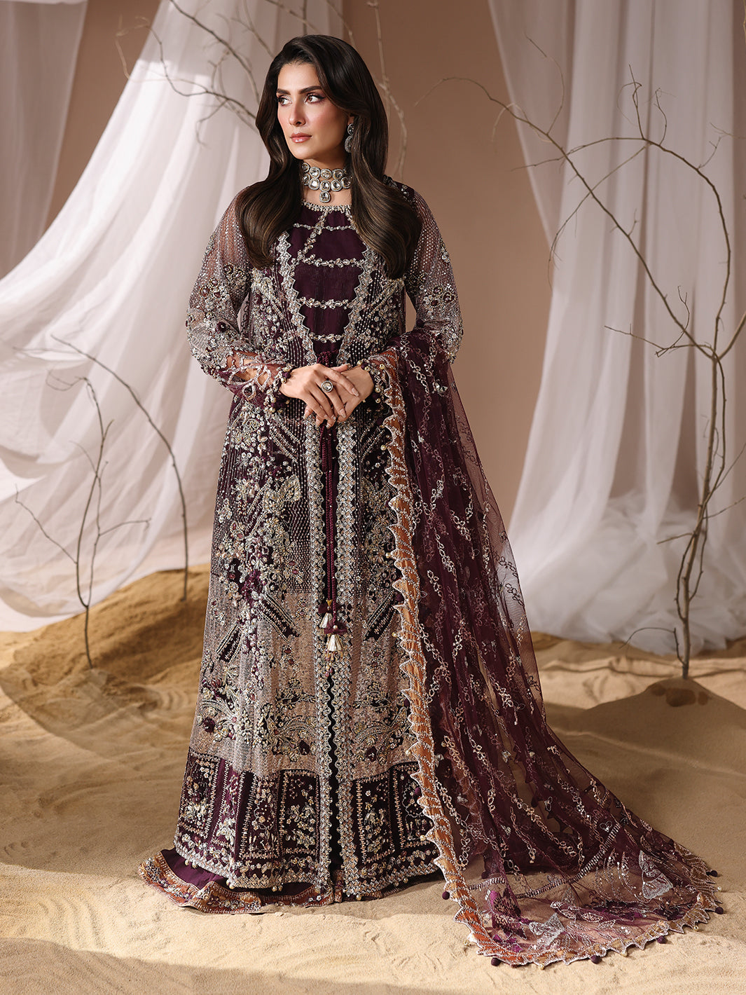 Stunning net gown, adorned with handcrafted adda work, naqshi dabka,pearls dazzling crystals, intricate chainwork,spangle embroidery, and traditional gotta patti. The gown is further embellished with delicate beads and playful paranda tassels,