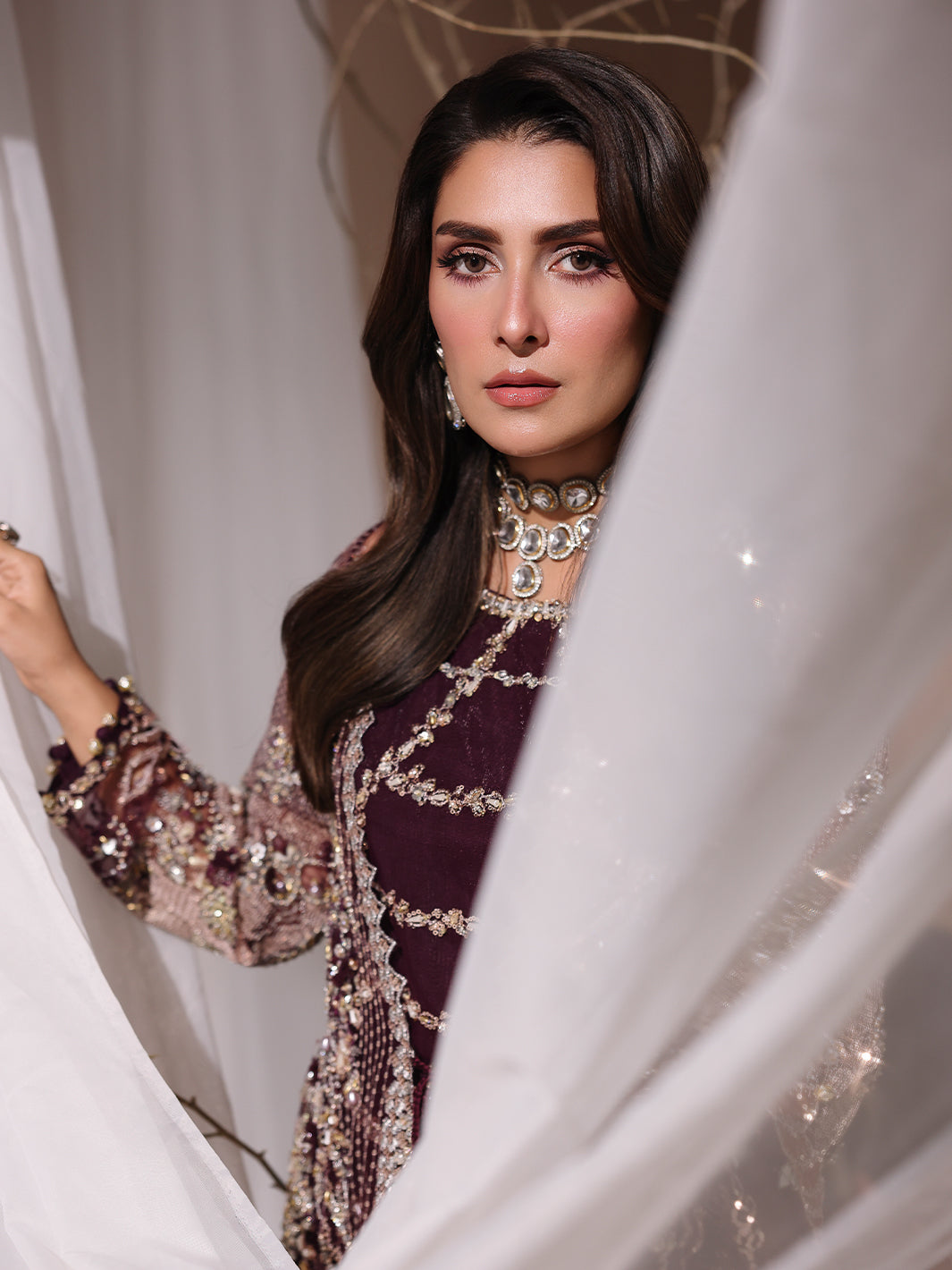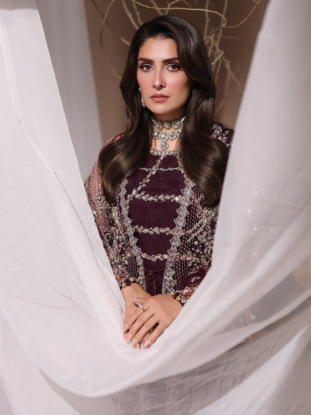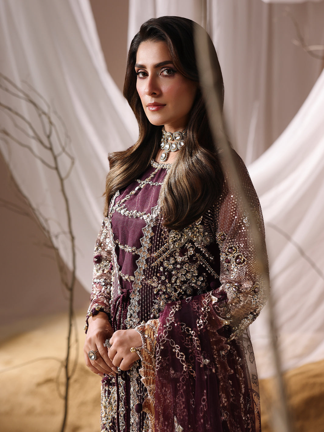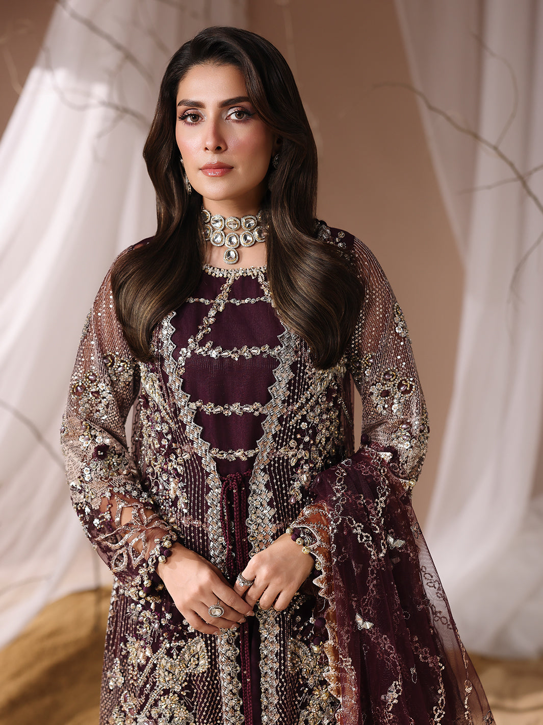 Stunning net gown, adorned with handcrafted adda work, naqshi dabka,pearls dazzling crystals, intricate chainwork,spangle embroidery, and traditional gotta patti. The gown is further embellished with delicate beads and playful paranda tassels,