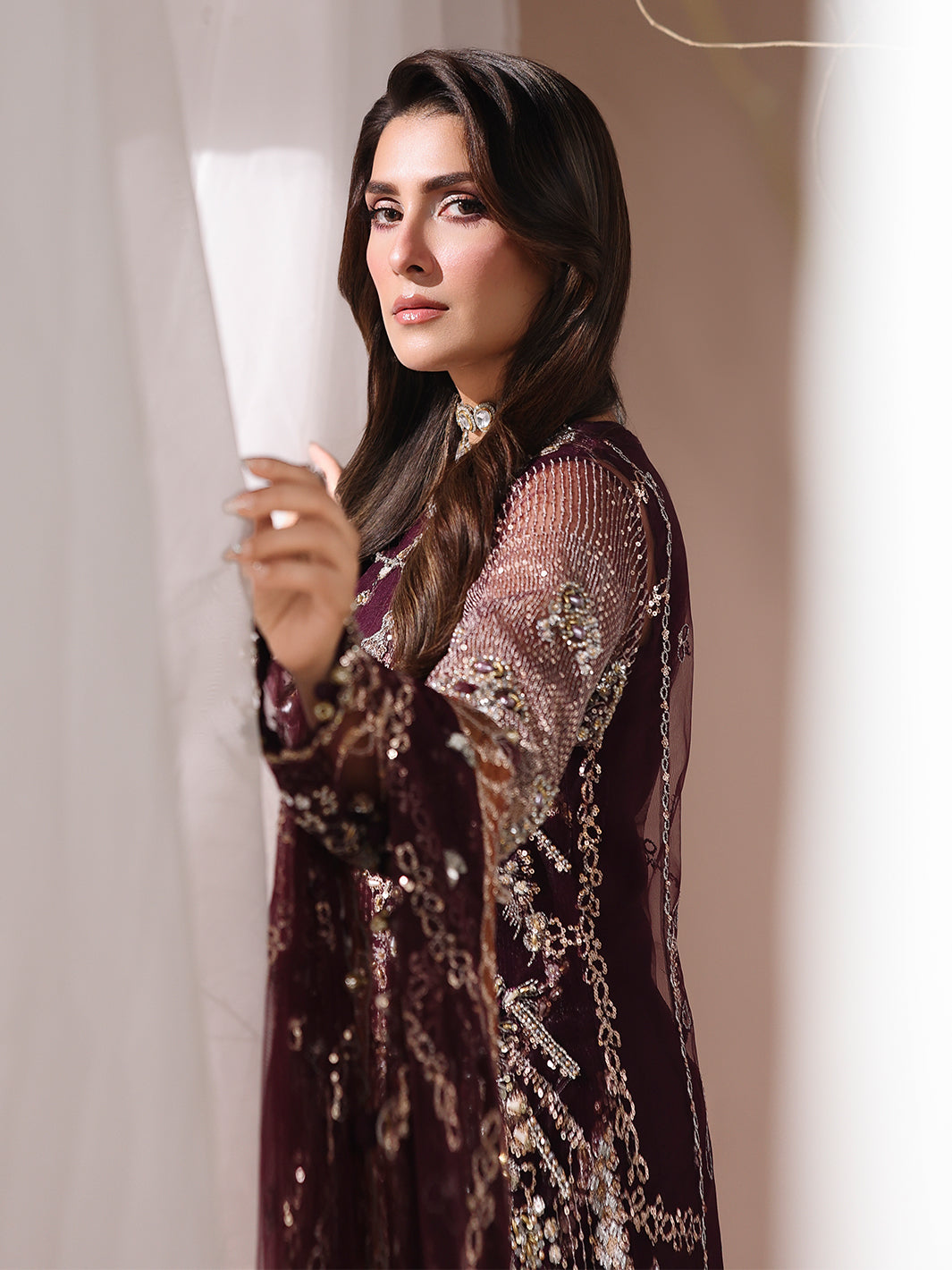 Net dupatta is a vision of beauty, crafted with sequin embroidery,mirror work, and a designed scalloped cutwork border,