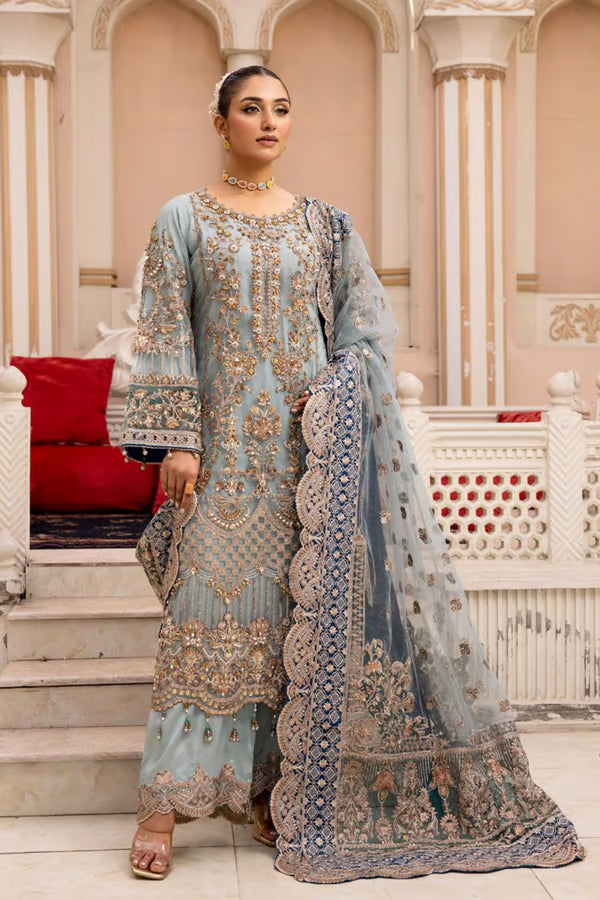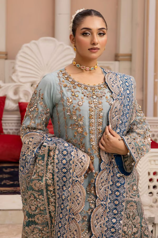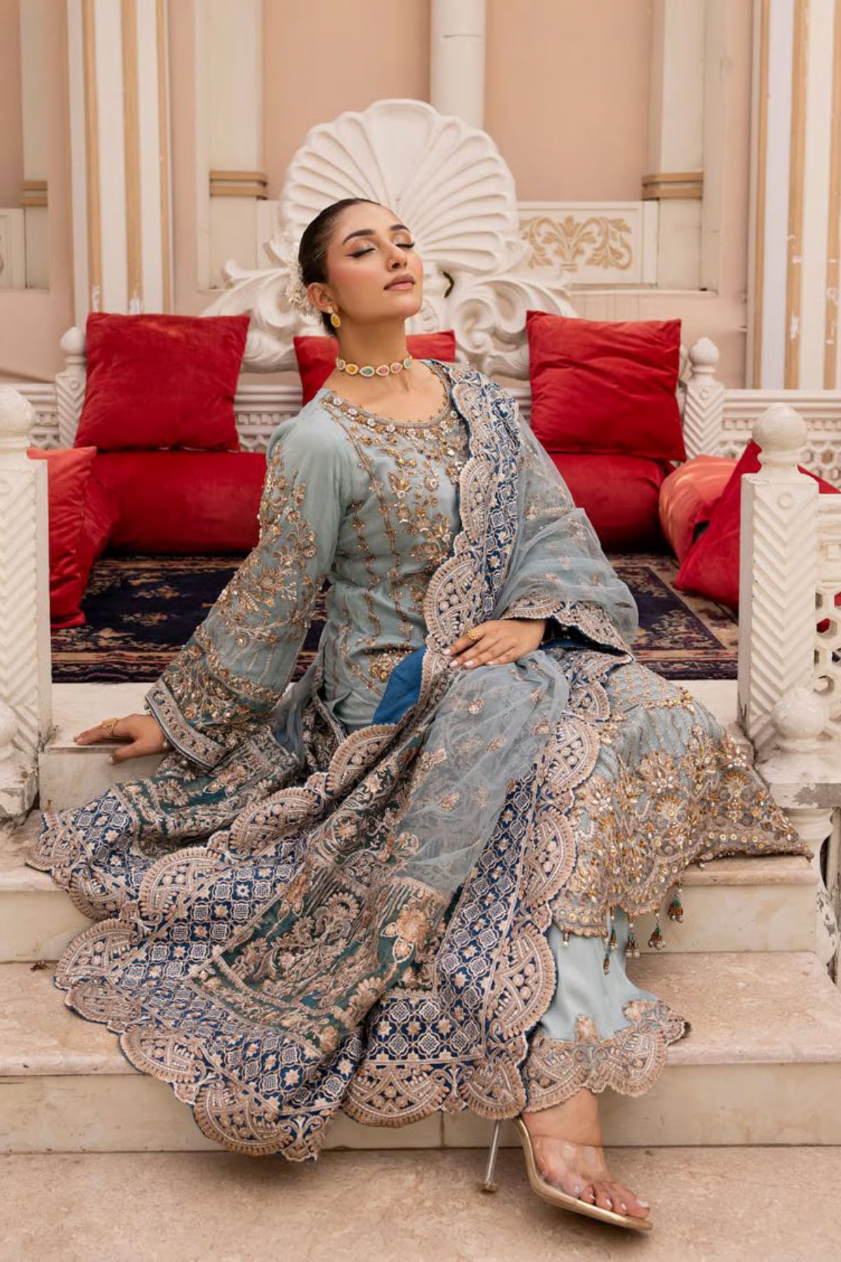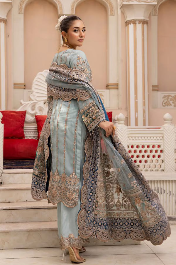 This beautiful 3 piece Imrozia collection suit features a straight shirt with luxury thread and bead work embroidery throughout, finished with dangling tassels on the border. It comes with full length embroidered sleeves and embroidered crepe plazo trousers. The look is finished with a net embroidered dupatta.