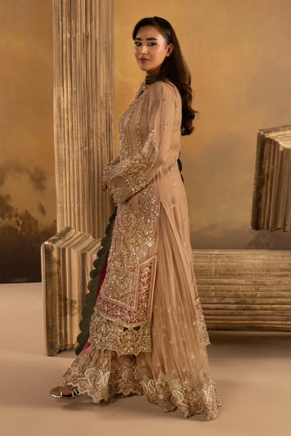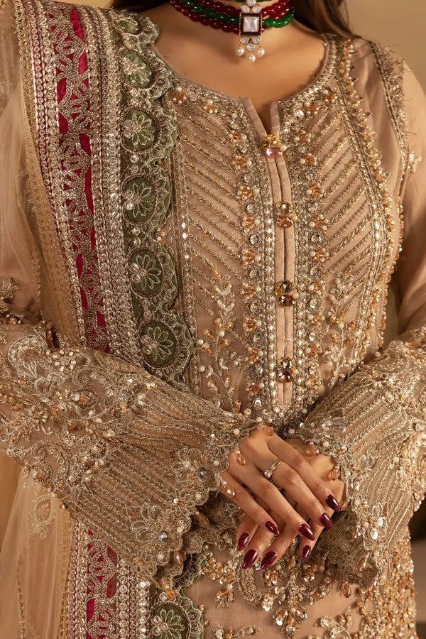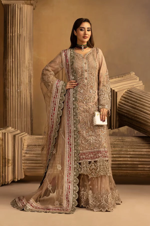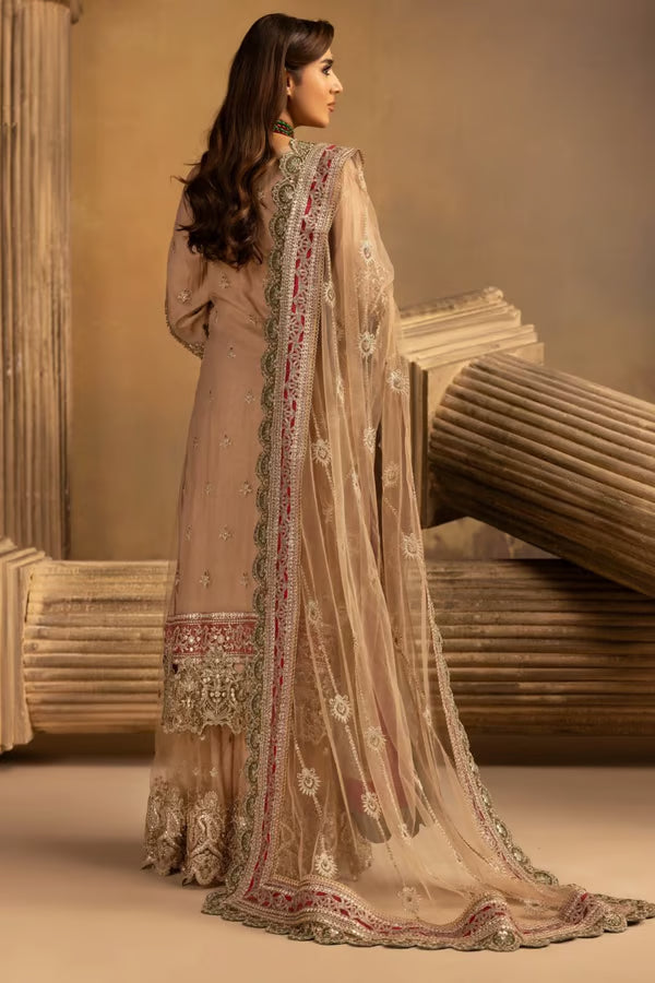 3 piece suit features a straight shirt with luxury thread work embroidery with motif and sequence embellishments with full length embroidered sleeves. Paired with a net embroidered sharara and the look is finished with a net embroidered dupatta.