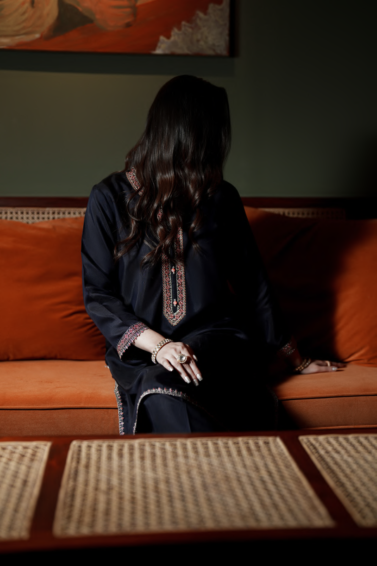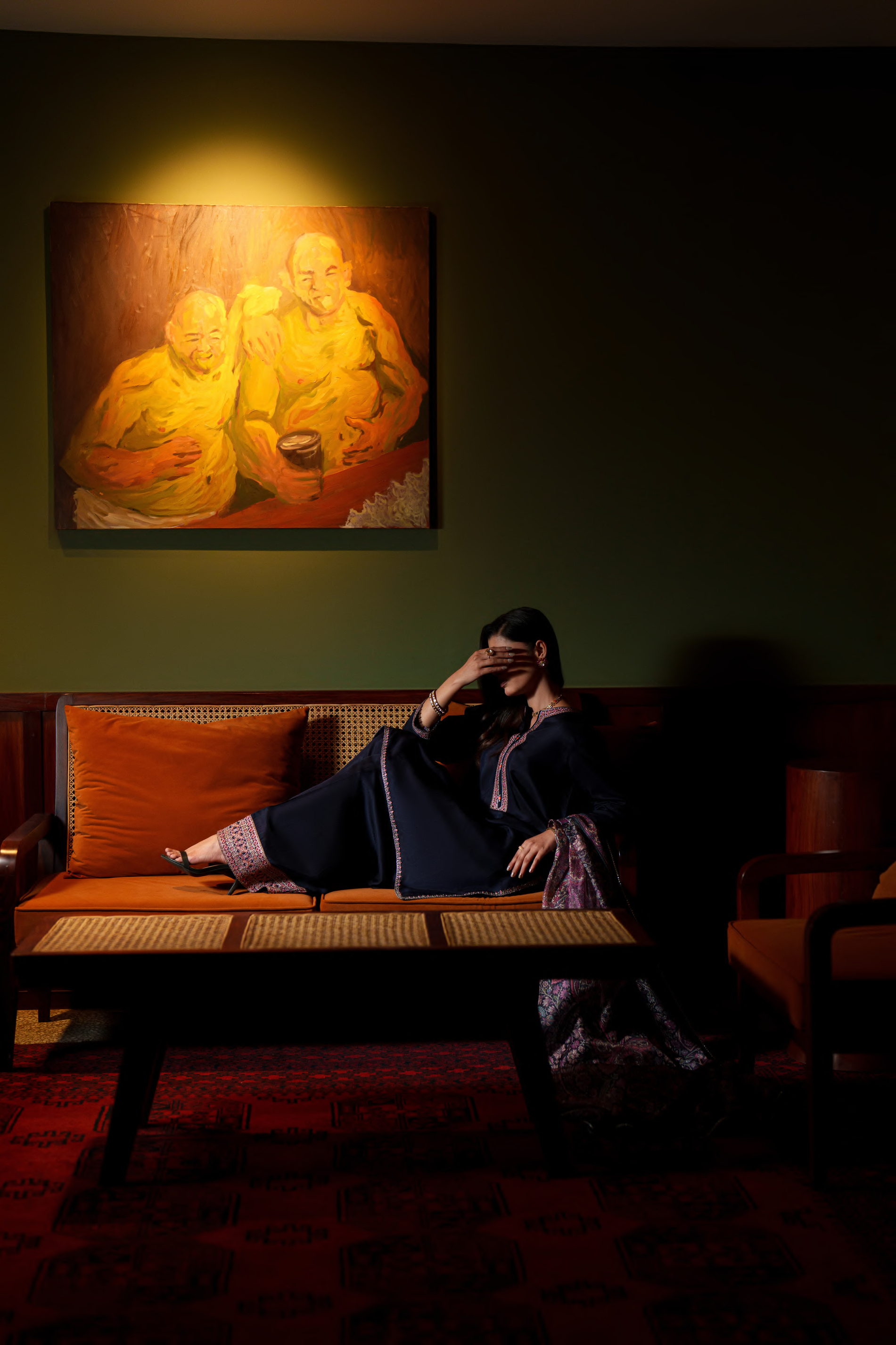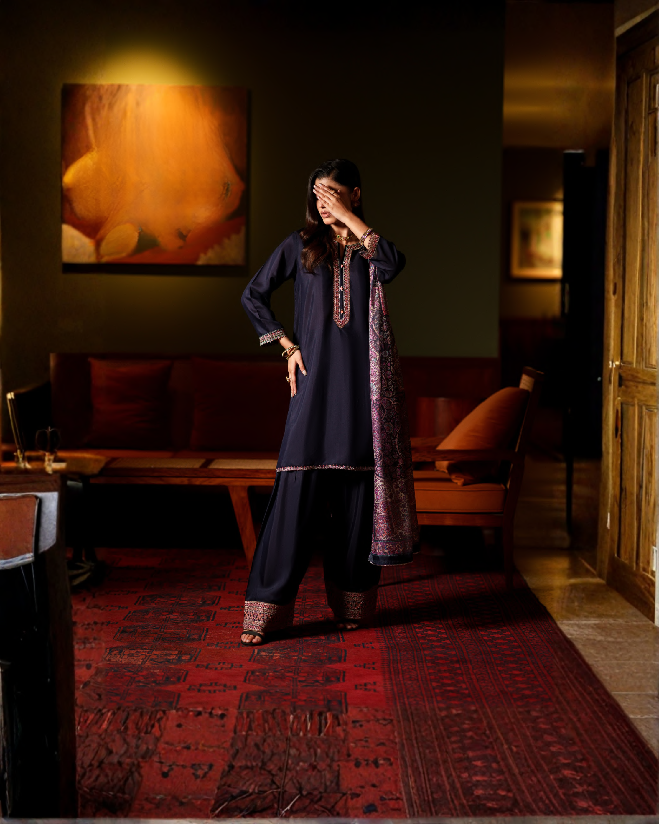 Discover understated opulence with the Aurelle Deep Midnight Blue Ensemble, crafted for timeless festive elegance. Set on a rich midnight blue canvas, the outfit is adorned with intricate embroidery and subtle festive detailing that adds depth without overpowering the look.