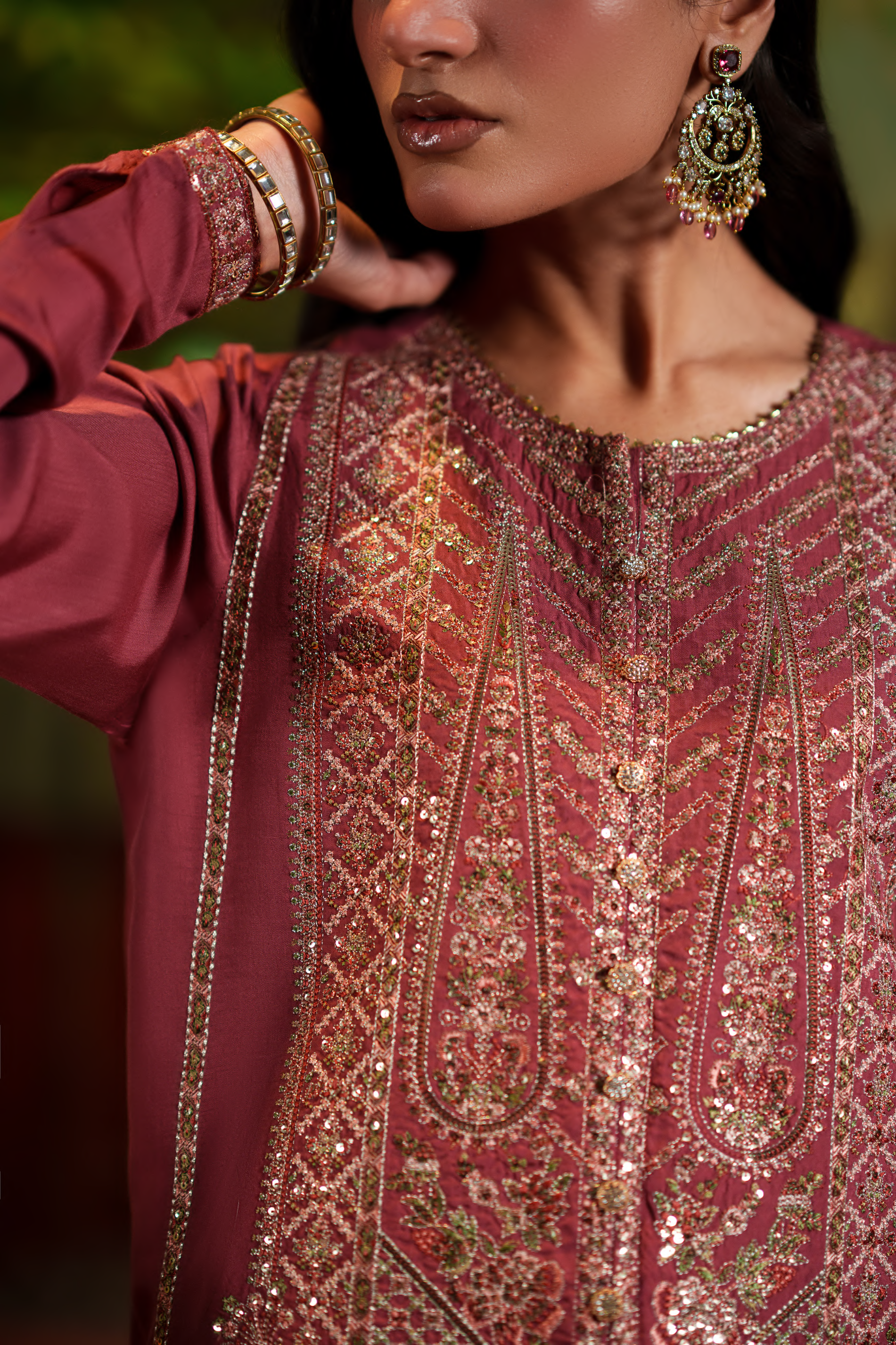 Experience elevated festive elegance with the Maribel Rich Rosewood Ensemble, crafted for timeless sophistication. Set on a deep rosewood base, the outfit is adorned with exquisite gold embroidery that adds warmth, richness, and a regal glow. The look is beautifully complemented by a patterned dupatta, enhancing the ensemble with graceful movement and refined detail.