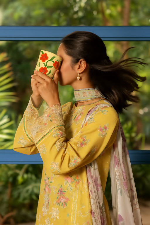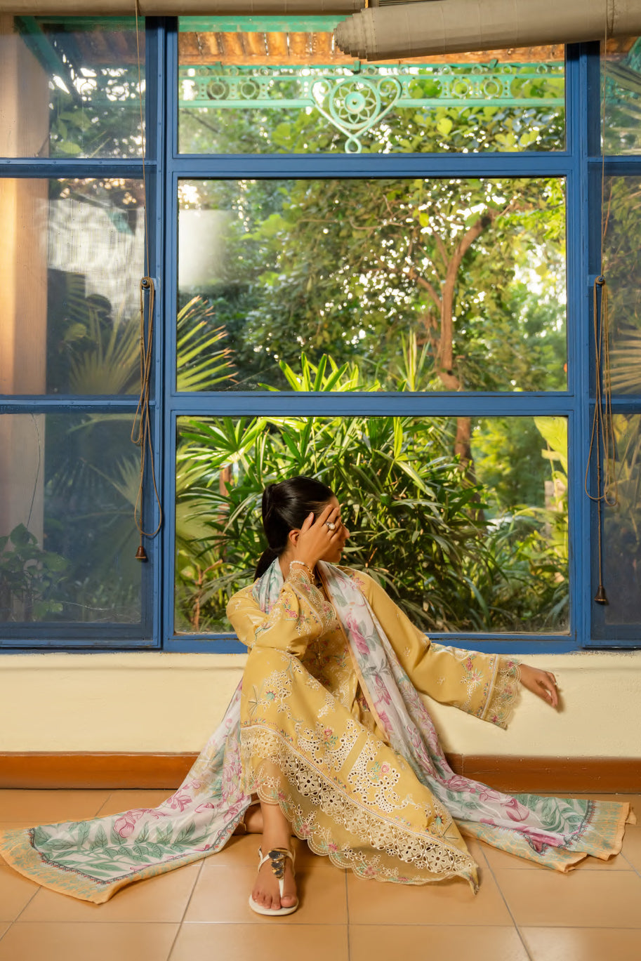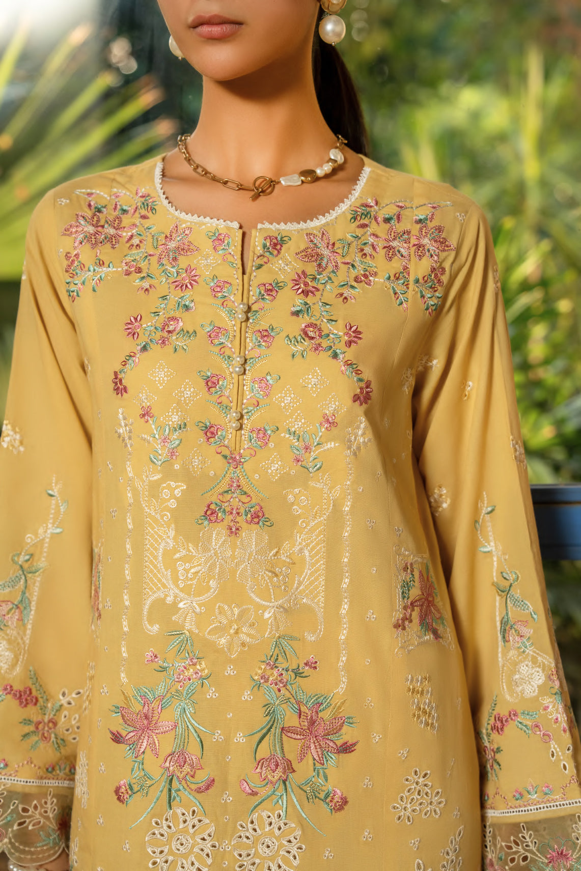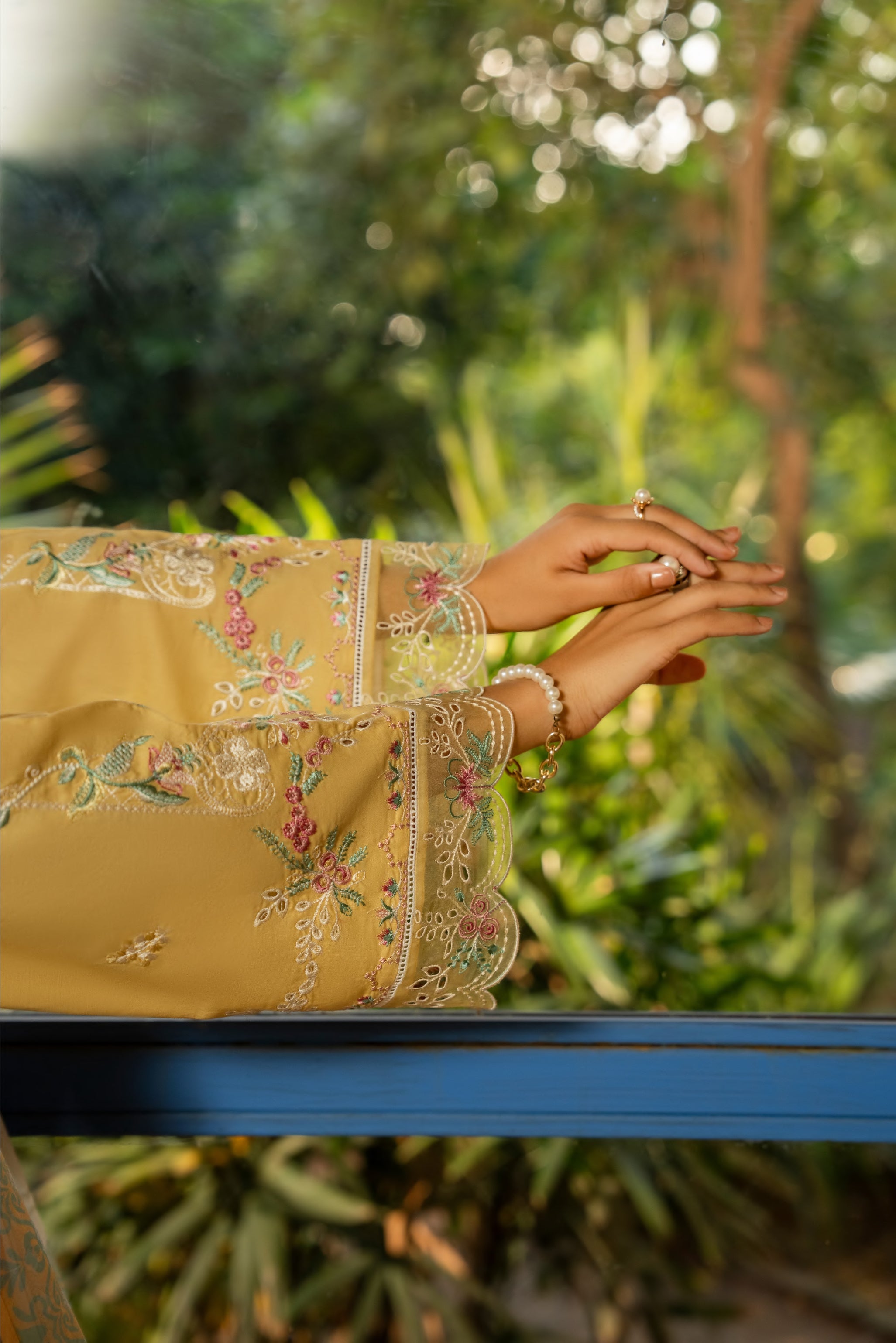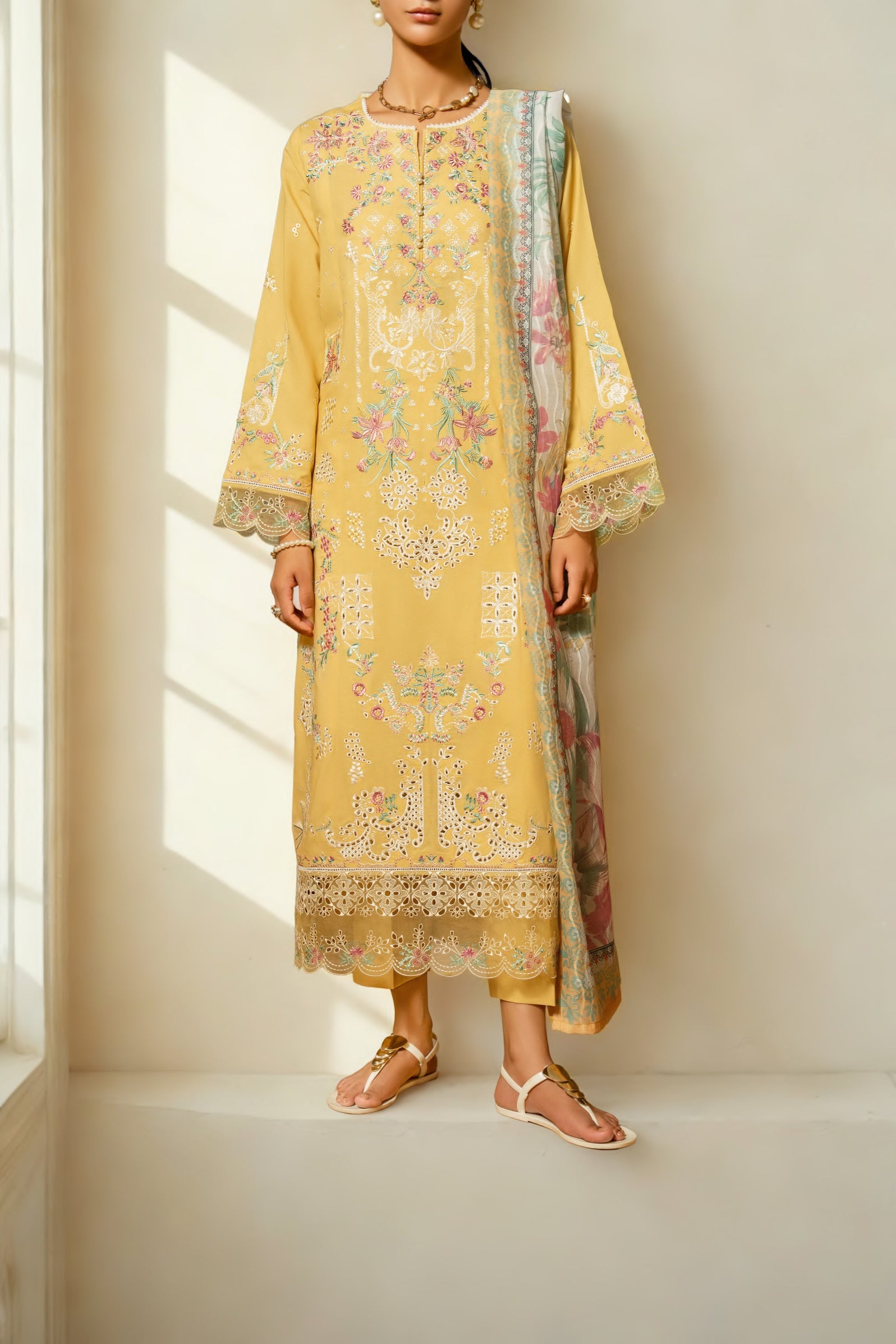 The kameez features delicate floral embroidery in soft pastel shades of pink, green, and white, beautifully accented with cutwork lace along the hem and sleeves, lending it an elegant and feminine charm.