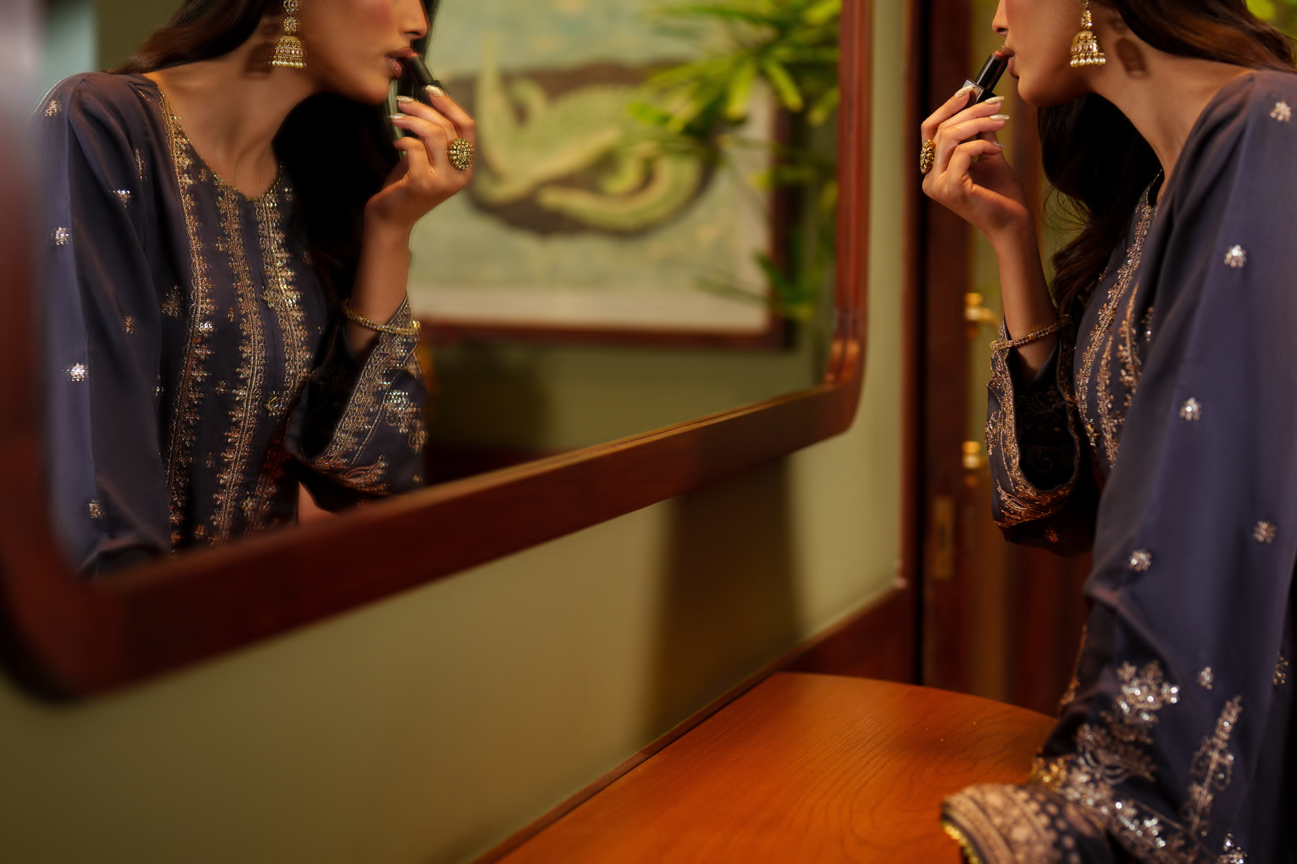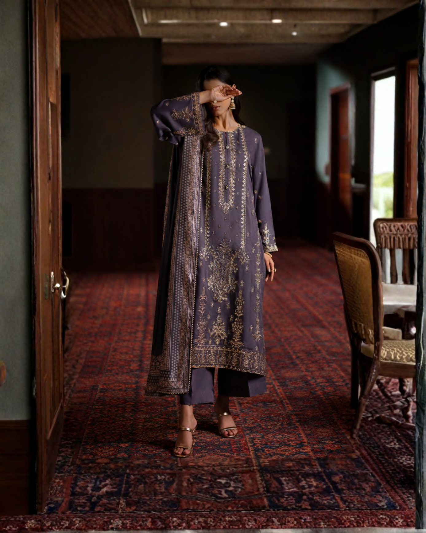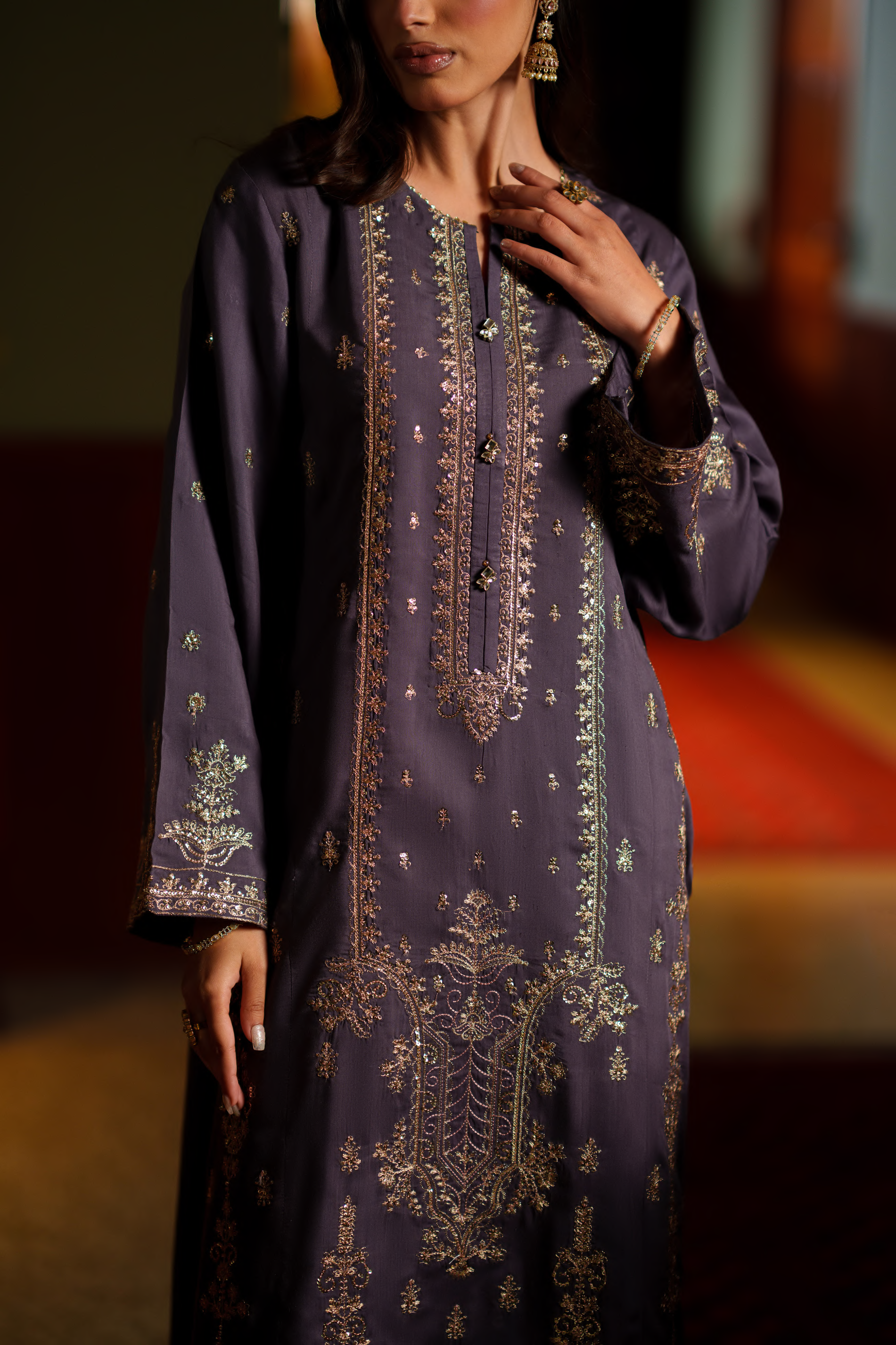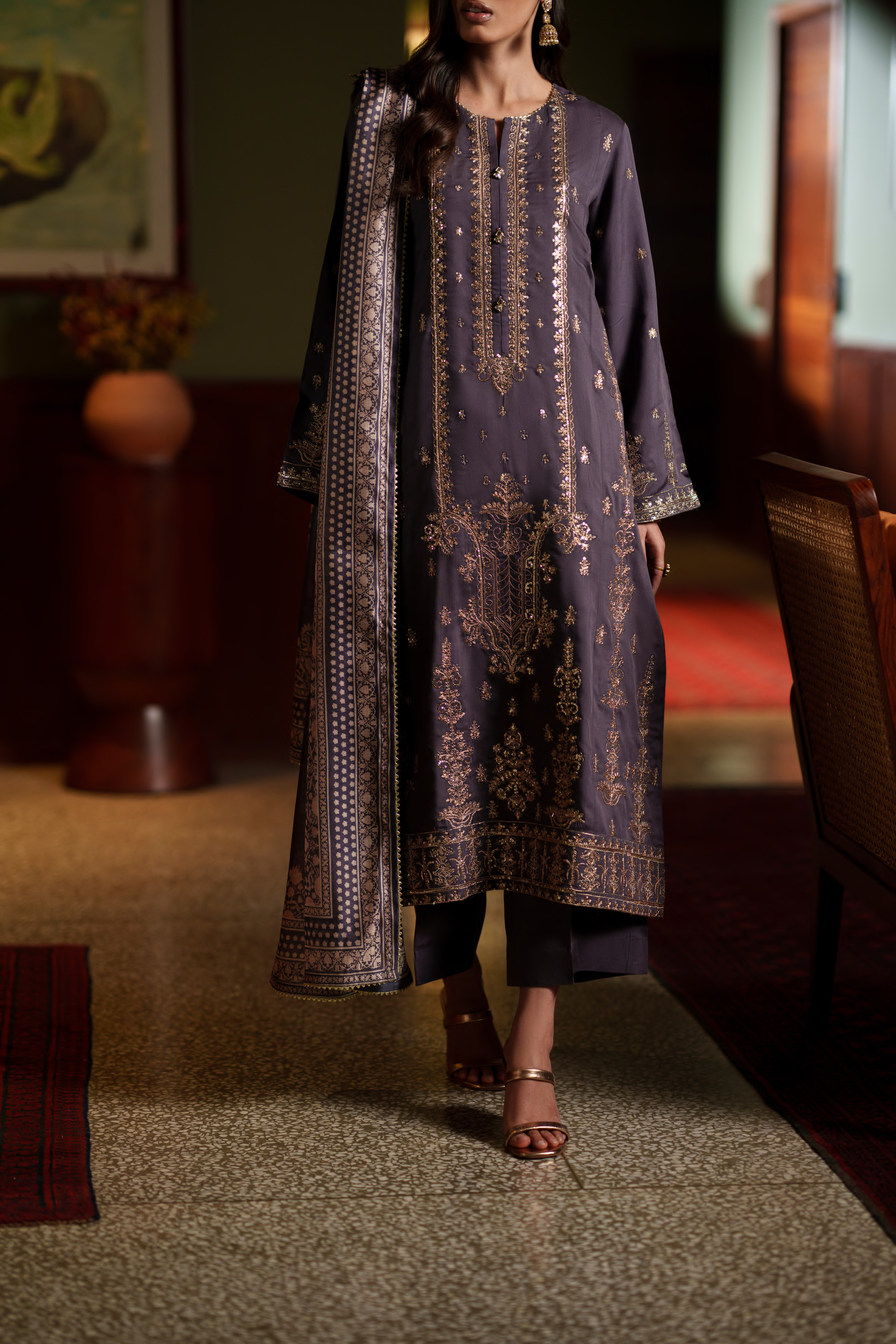 Step into understated sophistication with the Noctavia Charcoal Grey Ensemble, designed for modern festive elegance. Crafted on a rich charcoal grey base, this ensemble features a meticulously detailed neckline that serves as the statement element, enhancing the outfit with refined charm and subtle luxury. Perfect for evening festivities and formal gatherings, Noctavia embodies timeless grace with a contemporary edge.