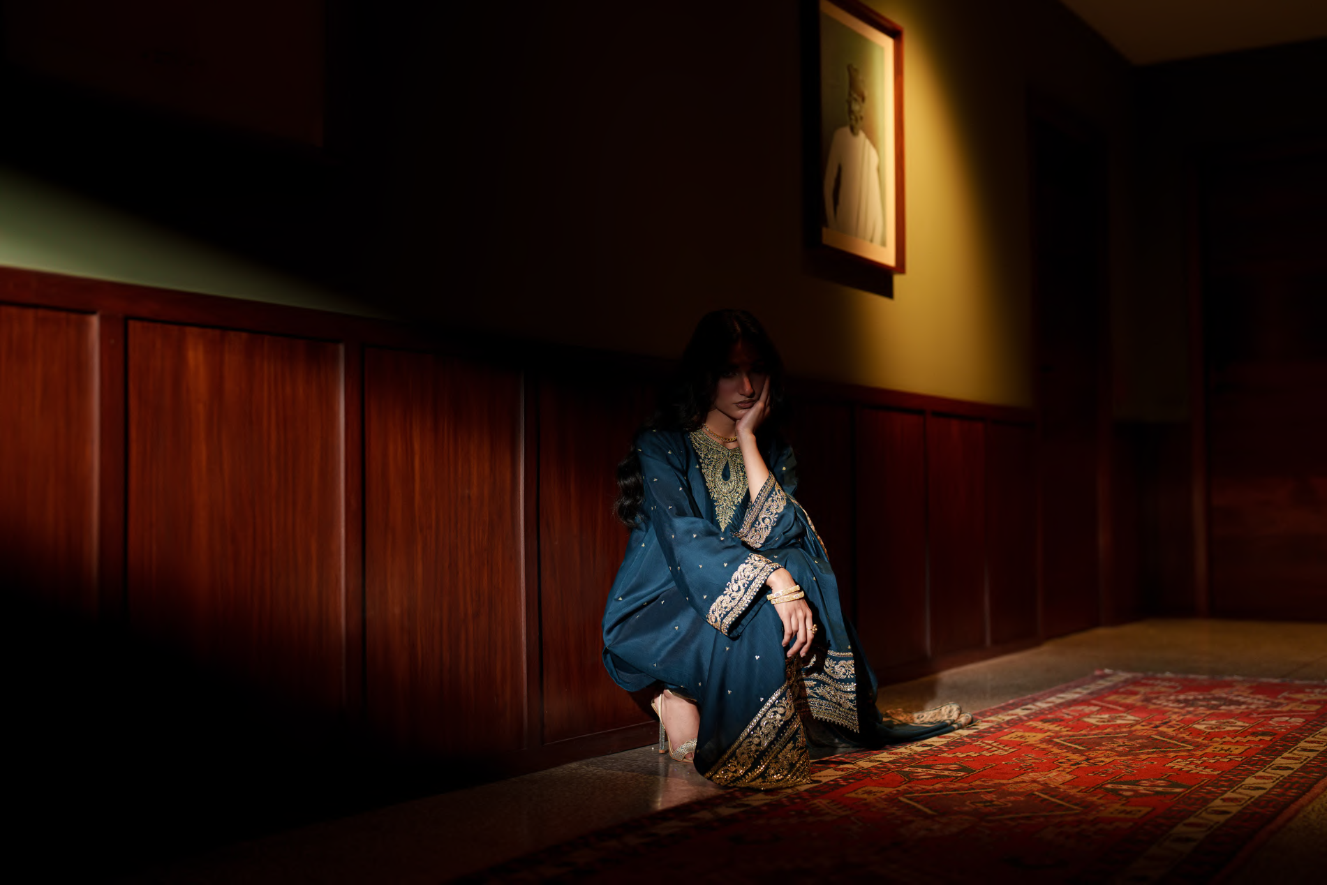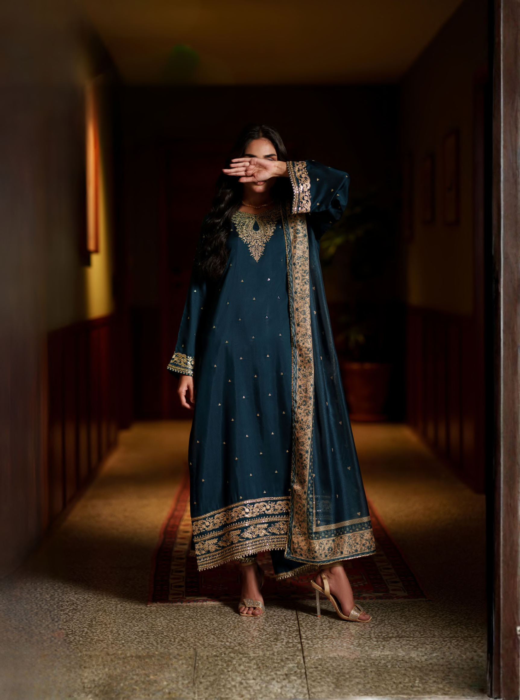 The finely tailored 3-piece outfit features a delicately detailed shirt paired with a sleek trouser and a coordinated dupatta, creating a harmonious balance between structure and softness. Every element is thoughtfully crafted to deliver timeless sophistication, making Opaline an ideal choice for festive evenings and elegant occasions.