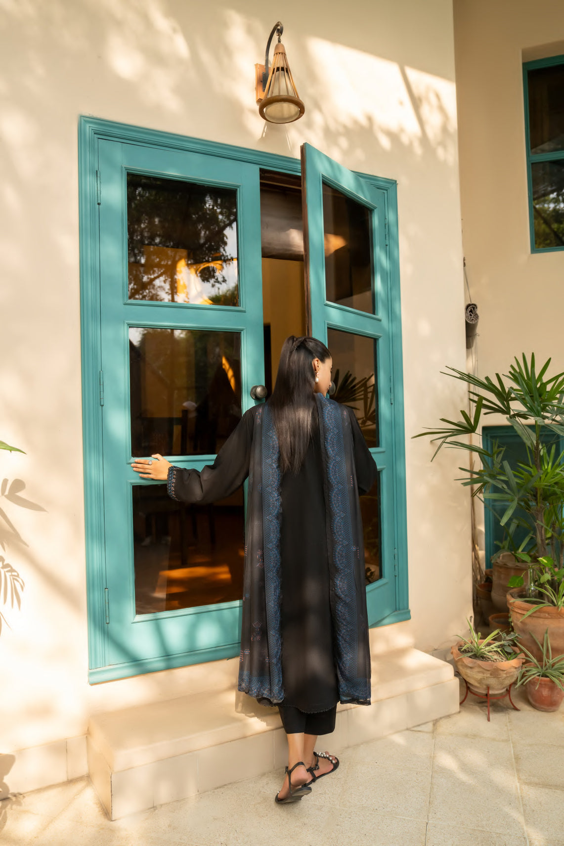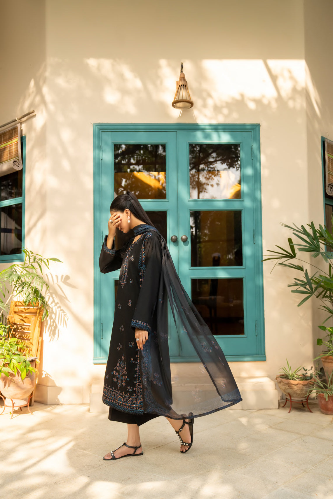 This outfit is a timeless black ensemble highlighted with intricate embroidery in rich shades of blue and copper.