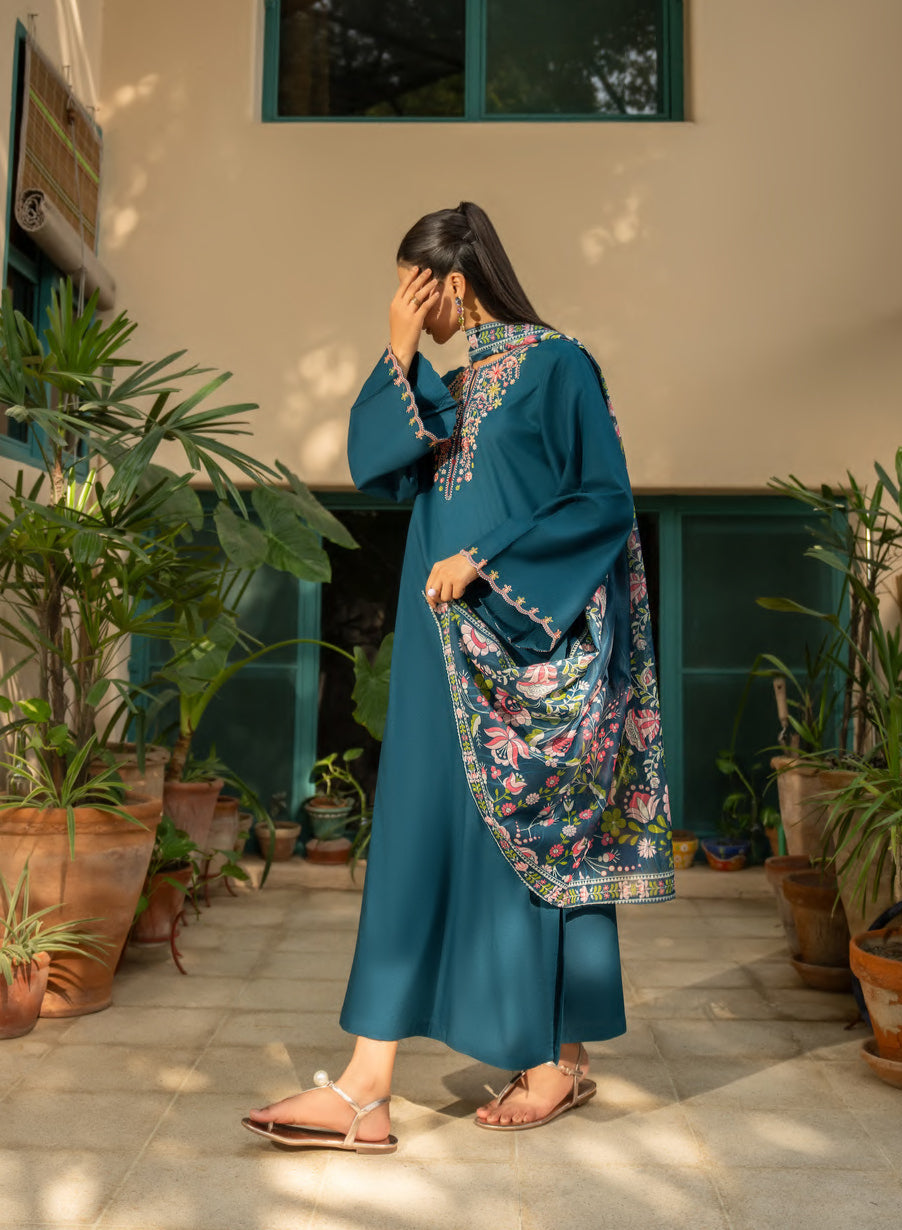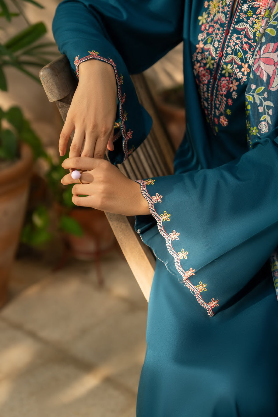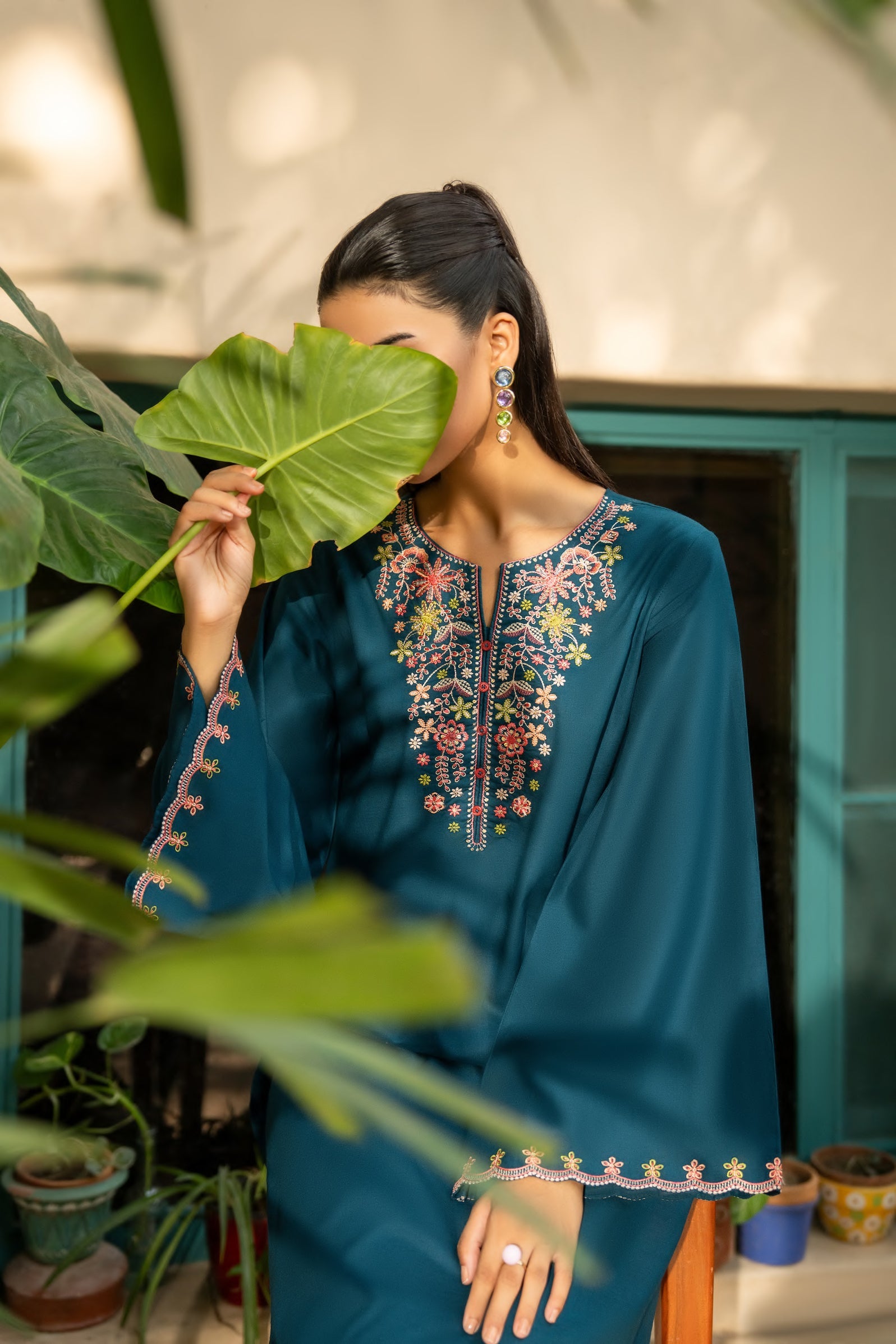 This outfit is a graceful teal ensemble that radiates understated elegance with vibrant detailing.