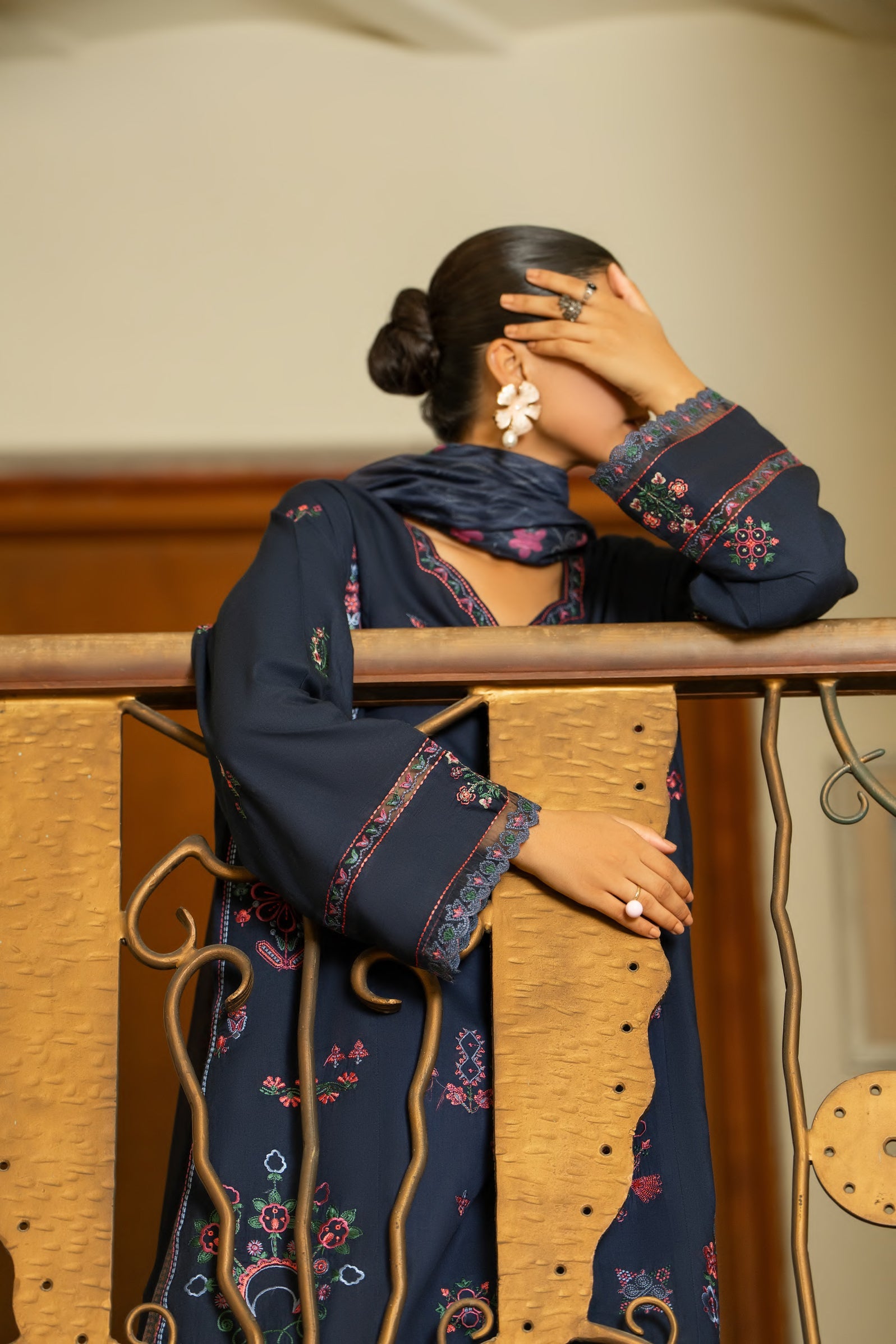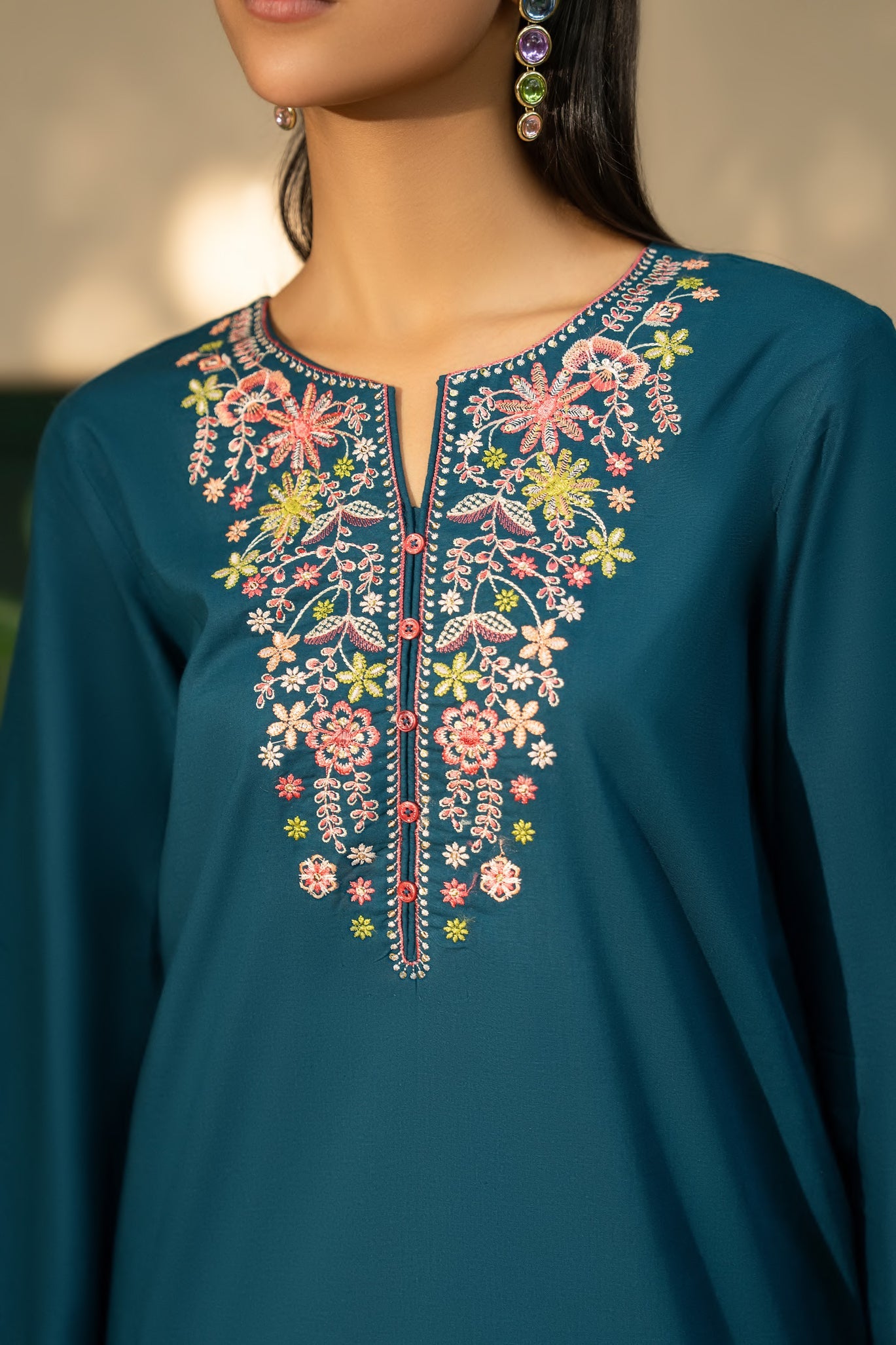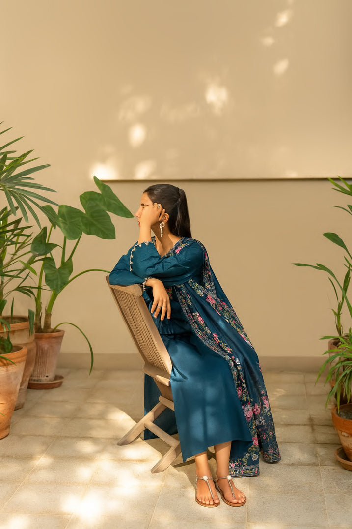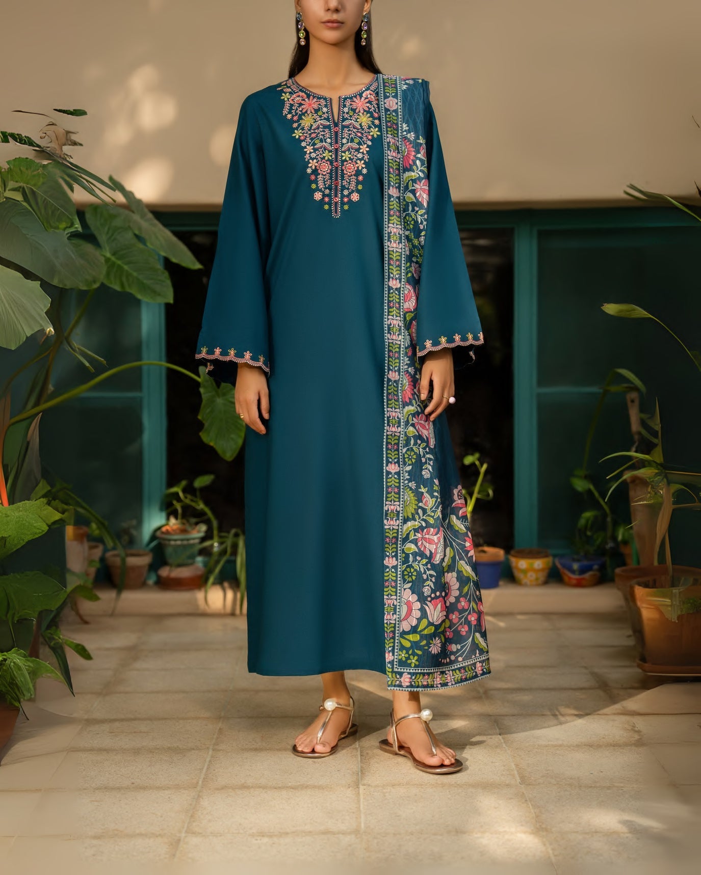 This outfit is a graceful teal ensemble that radiates understated elegance with vibrant detailing.
