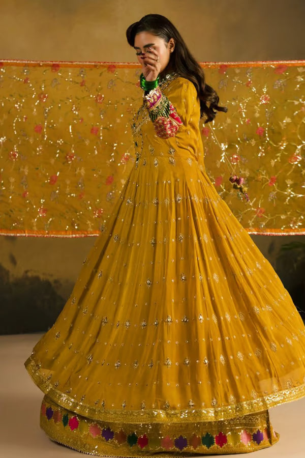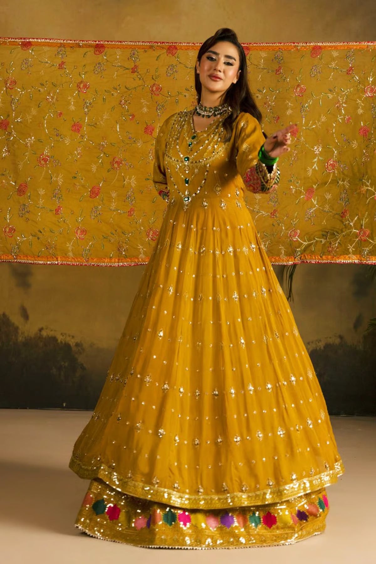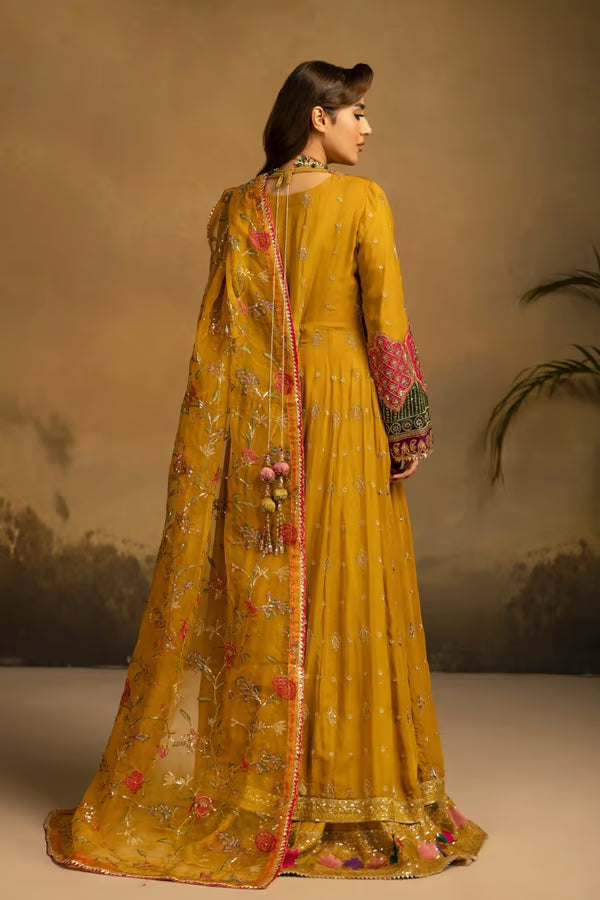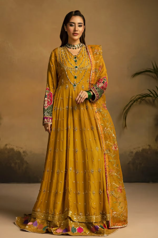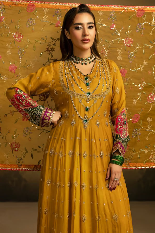 3 piece Rafia collection suit features a straight shirt with luxury thread and bead and motif embroidered front, finished with dangling beads on the border. It comes with full length embroidered sleeves and an embroidered gharara. The look is finished with a net embroidered dupatta.