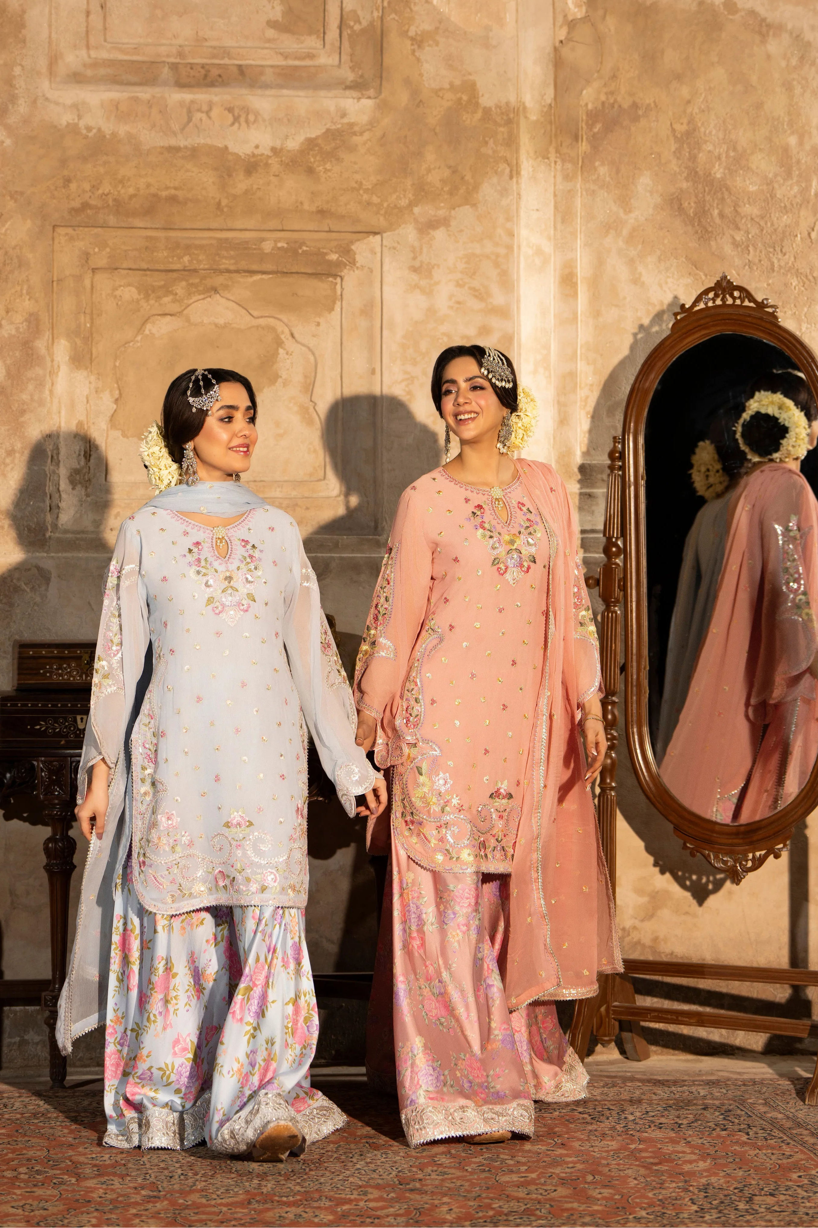 Description: Shirt: Georgette Shirt with Thread work Embroidery and Cut work Sleeves Dupatta: Crinkle Chiffon Embroidered Dupatta with all around Silver Gotti Trouser: BABY PINK F-524 Printed Silk Sharara