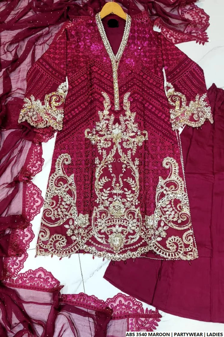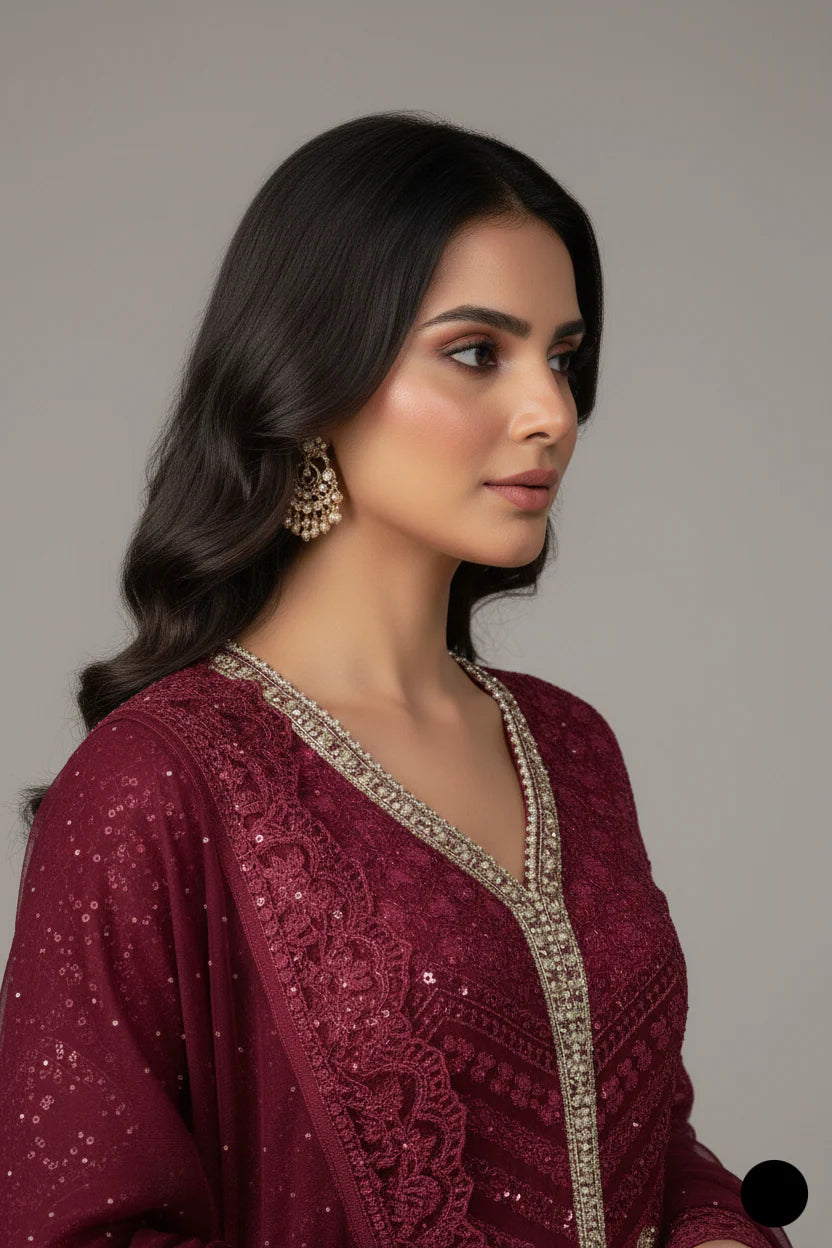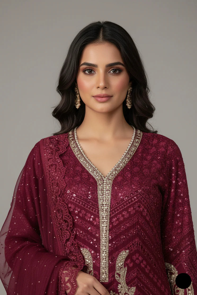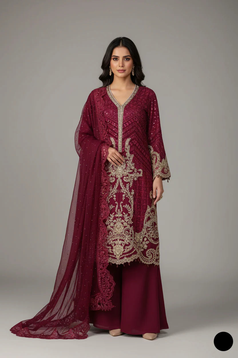 This three‑piece suit combines a flowing chiffon A‑line shirt, soft viscose plazo trousers, and a matching chiffon dupatta to create an ensemble that drapes beautifully. Chiffon is prized for its lightweight, breathable and sheer texture, which adds grace and movement to the shirt and dupatta, while viscose brings a silk-like softness and excellent drape to the trousers — an ideal pairing for both comfort and visual elegance. At approximately 1.200 kg, this suit strikes a balance between delicate silhouette and luxurious feel—slightly heavier than standard 3‑piece chiffon sets (which often weigh around 850 g)—providing a bit more substance without compromising on airiness. The A‑line top flares elegantly into a graceful palazzo hemline, making it perfect for formal occasions, weddings, or festive gatherings where you prefer refined modern styling over fitted cuts.
