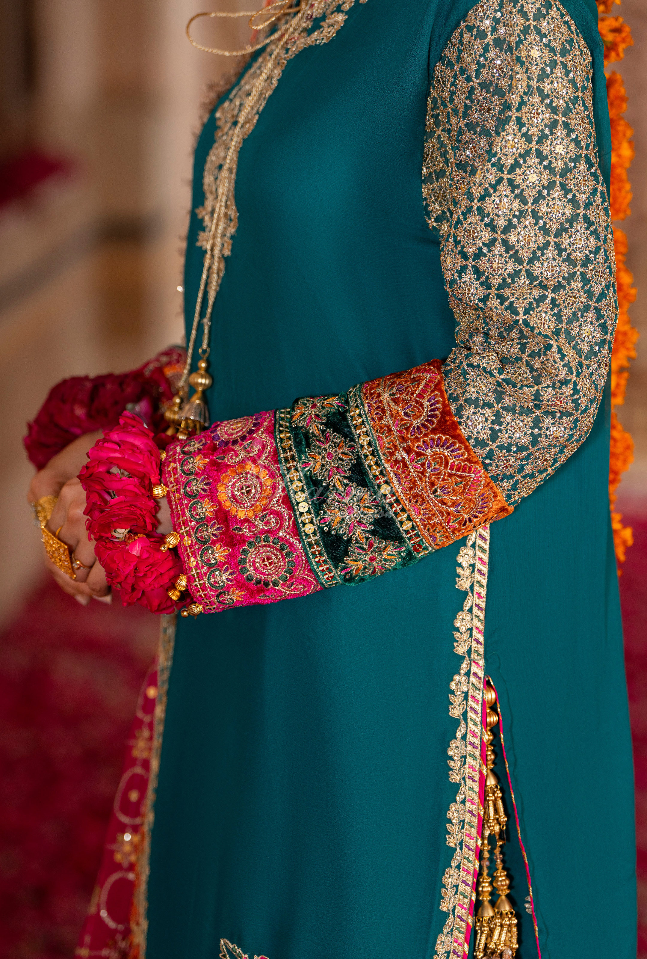 Chiffon Round Border Shirt with Tilla, Sequence, Panni work and Tussels on Neckline (VelvetPatches on Sleeves)